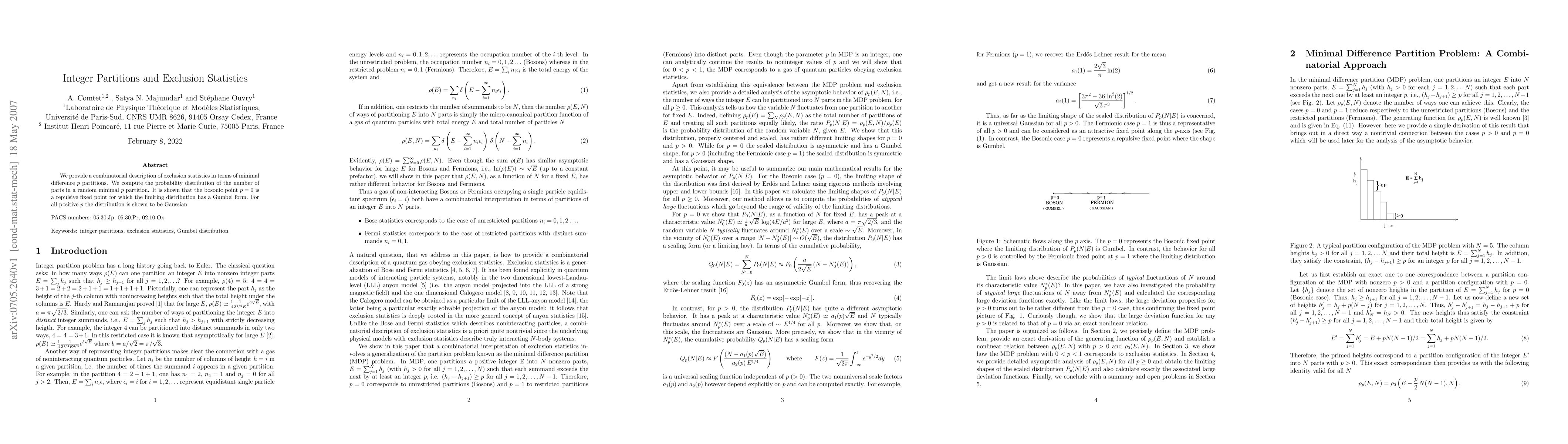 We provide a combinatorial description of exclusion statistics in terms of minimal difference $p$ partitions. We compute the probability distribution of the number of parts in a random minimal $p$ partition. It is shown that the bosonic point $ p=0$ is a repulsive fixed point for which the limiting distribution has a Gumbel form. For all positive $p$ the distribution is shown to be Gaussian.