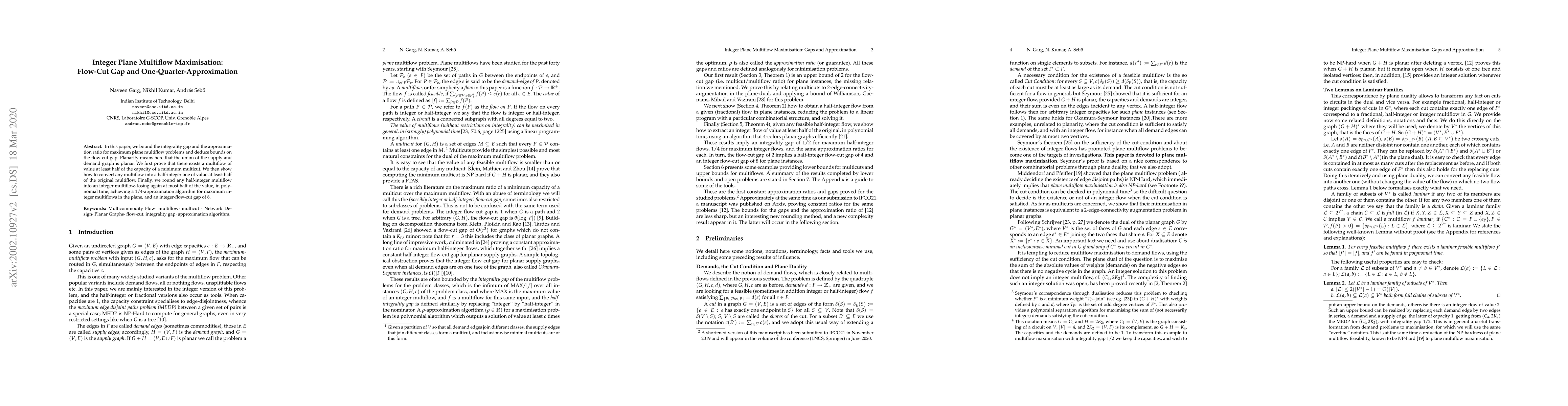 This paper proves a $1/4$-approximation algorithm for maximum integer multiflows in the plane, achieving an integer-flow-cut gap of 8, by bounding the integrality gap and conversion between half-integer and integer multiflows.