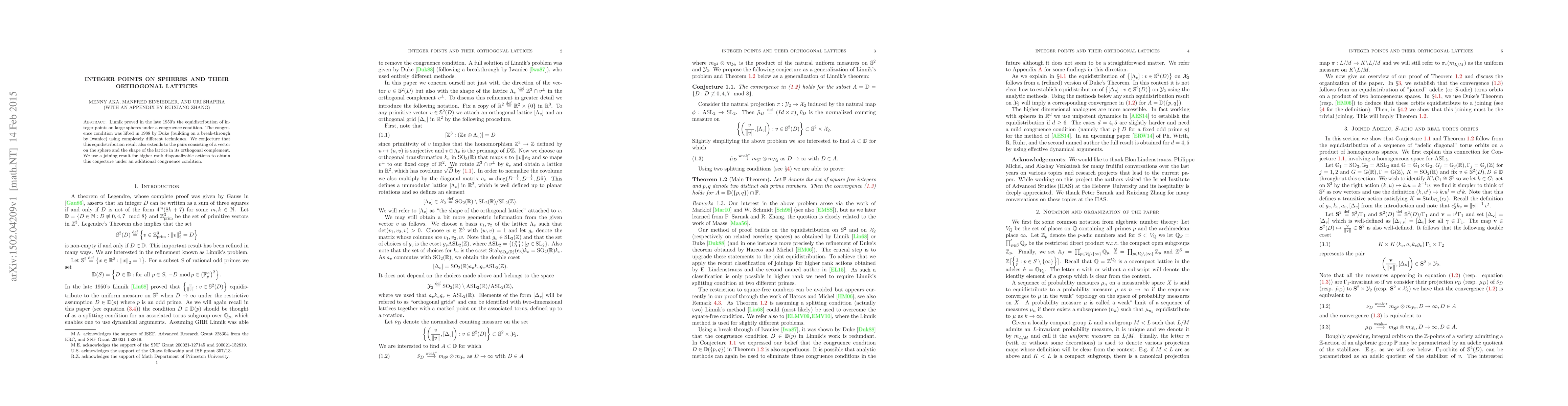 Linnik proved in the late 1950's the equidistribution of integer points on large spheres under a congruence condition. The congruence condition was lifted in 1988 by Duke (building on a break-through by Iwaniec) using completely different techniques. We conjecture that this equidistribution result also extends to the pairs consisting of a vector on the sphere and the shape of the lattice in its orthogonal complement. We use a joining result for higher rank diagonalizable actions to obtain this conjecture under an additional congruence condition.