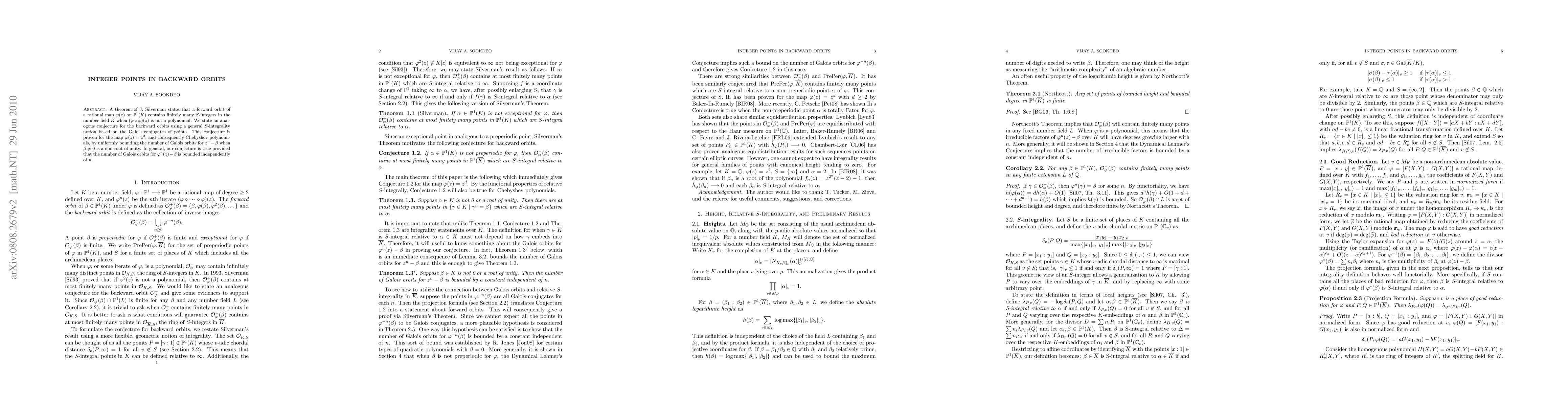 The paper proves a conjecture about backward orbits of rational maps, stating that forward orbits contain finitely many integers when $( ho ho)(z)$ is not polynomial, with specific results shown for $z^d$ and Chebyshev polynomials.