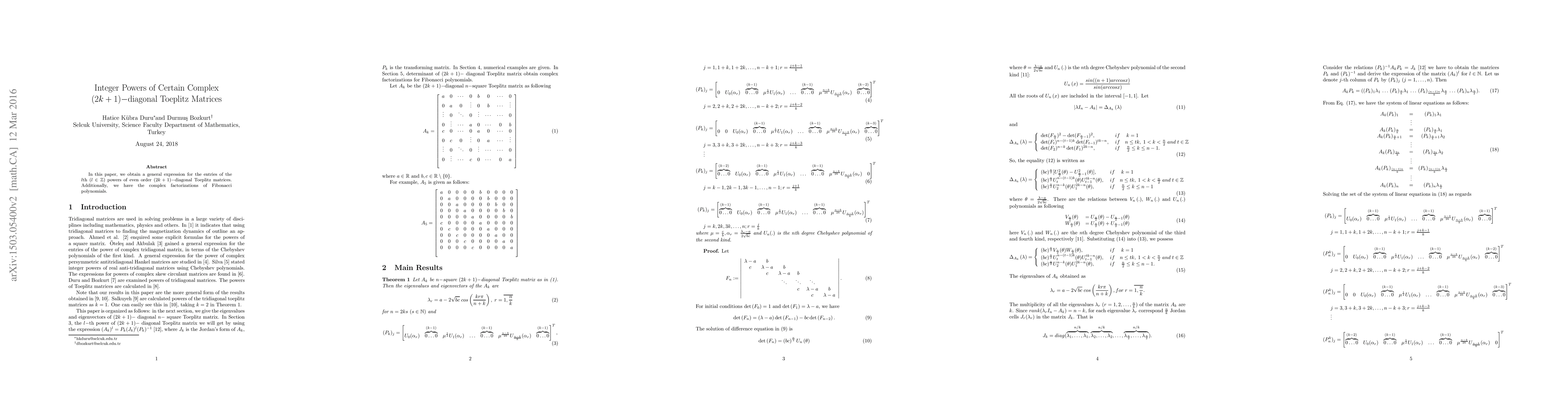 This paper provides a general formula for the entries of integer powers of even order (2k+1)-diagonal Toeplitz matrices and explores the complex factorizations of Fibonacci polynomials.