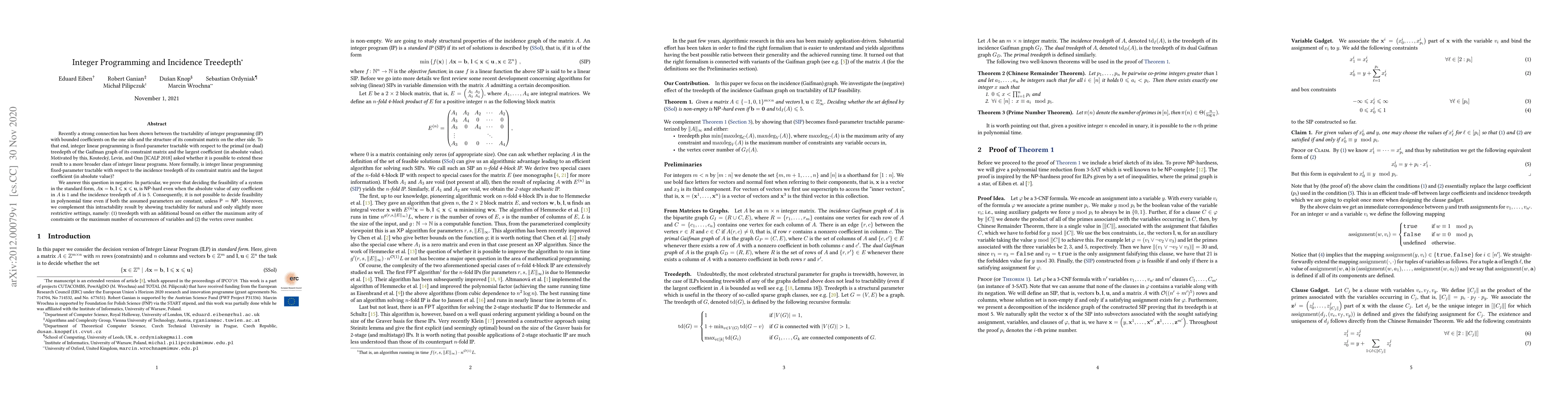 Recently a strong connection has been shown between the tractability of integer programming (IP) with bounded coefficients on the one side and the structure of its constraint matrix on the other side. To that end, integer linear programming is fixed-parameter tractable with respect to the primal (or dual) treedepth of the Gaifman graph of its constraint matrix and the largest coefficient (in absolute value). Motivated by this, Kouteck\'y, Levin, and Onn [ICALP 2018] asked whether it is possible to extend these result to a more broader class of integer linear programs. More formally, is integer linear programming fixed-parameter tractable with respect to the incidence treedepth of its constraint matrix and the largest coefficient (in absolute value)? We answer this question in negative. In particular, we prove that deciding the feasibility of a system in the standard form, ${A\mathbf{x} = \mathbf{b}}, {\mathbf{l} \le \mathbf{x} \le \mathbf{u}}$, is $\mathsf{NP}$-hard even when the absolute value of any coefficient in $A$ is 1 and the incidence treedepth of $A$ is 5. Consequently, it is not possible to decide feasibility in polynomial time even if both the assumed parameters are constant, unless $\mathsf{P}=\mathsf{NP}$. Moreover, we complement this intractability result by showing tractability for natural and only slightly more restrictive settings, namely: (1) treedepth with an additional bound on either the maximum arity of constraints or the maximum number of occurrences of variables and (2) the vertex cover number.