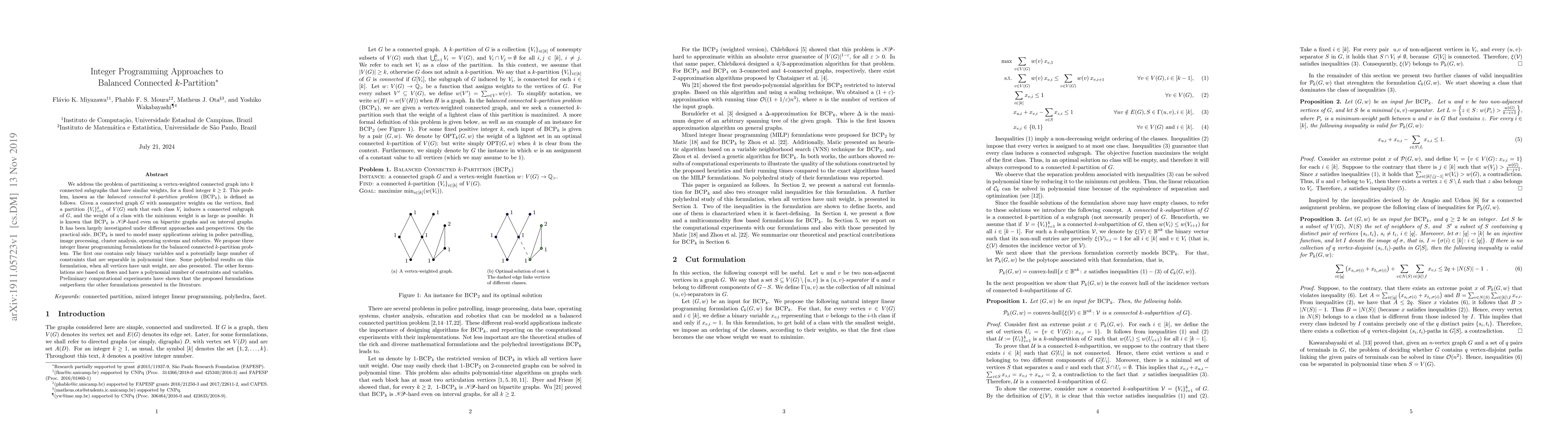 This paper proposes three integer linear programming formulations for the balanced connected $k$-partition problem ($BCP_k$), aiming to partition a vertex-weighted connected graph into $k$ connected subgraphs with similar weights. Preliminary results indicate that the proposed formulations outperform existing methods.