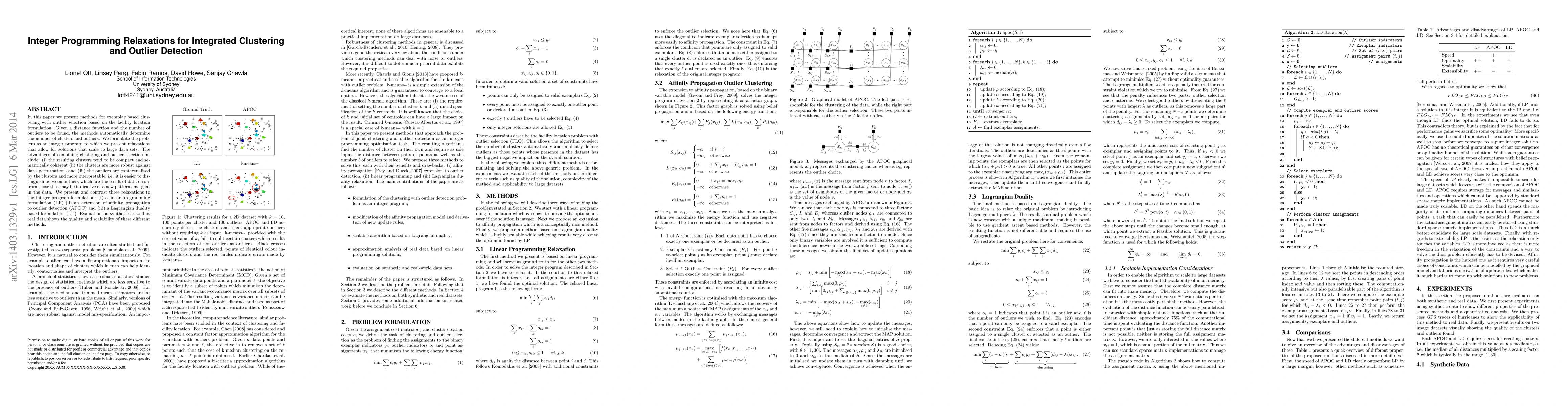 This paper proposes methods for clustering and outlier detection using an integer programming relaxation approach. It presents three relaxations—linear programming, affinity propagation extension, and Lagrangian duality—to scale the method to large datasets, demonstrating improved cluster compactness, robustness, and interpretability of outliers.
