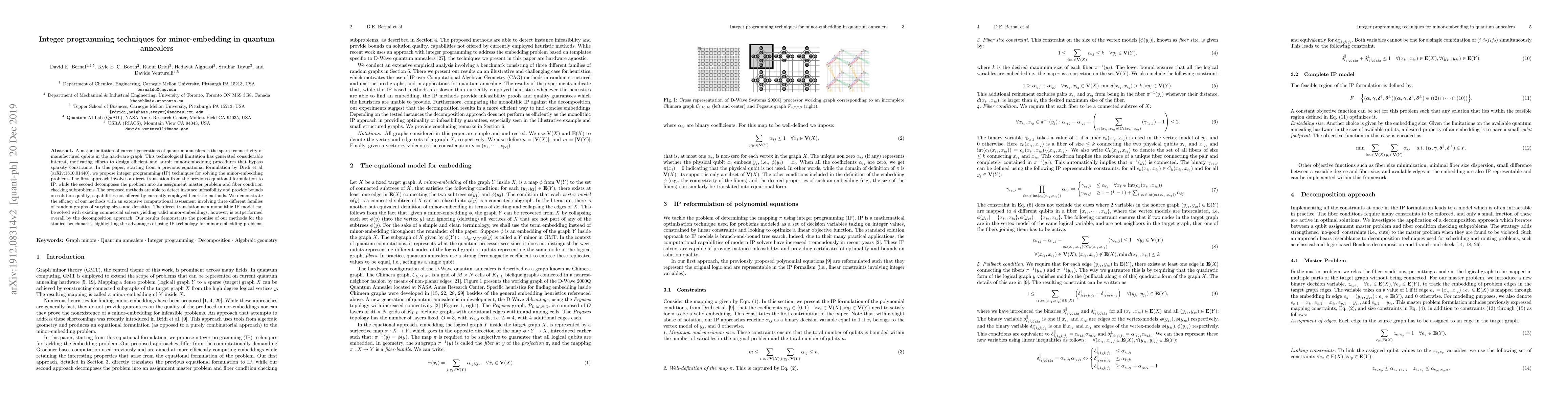 This paper proposes integer programming techniques to solve the minor-embedding problem in quantum annealers, addressing the hardware's sparse qubit connectivity. The methods include a direct IP translation and a decomposed approach, showing improved infeasibility detection and solution quality bounds compared to heuristics.