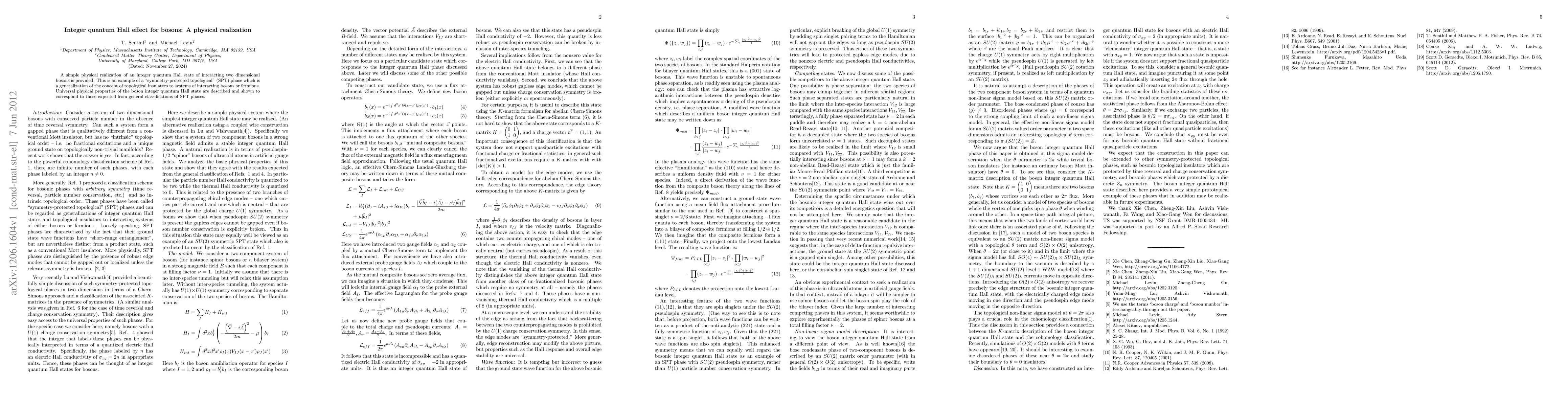 This paper presents a physical realization of an integer quantum Hall state for interacting two-dimensional bosons, exemplifying a "symmetry-protected topological" (SPT) phase. The study describes universal properties of this state, aligning with general classifications of SPT phases.
