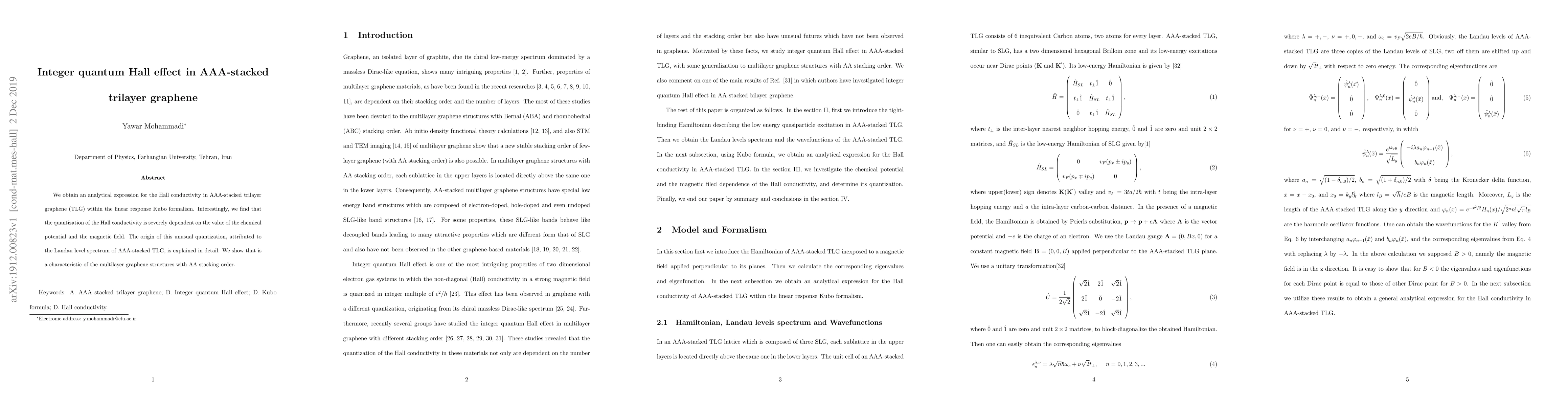 The research provides an analytical model for Hall conductivity in AAA-stacked trilayer graphene, revealing that its quantization is heavily influenced by chemical potential and magnetic field, a phenomenon linked to the unique Landau level spectrum of this structure. This behavior is highlighted as a distinct feature of multilayer graphene with AA stacking order.