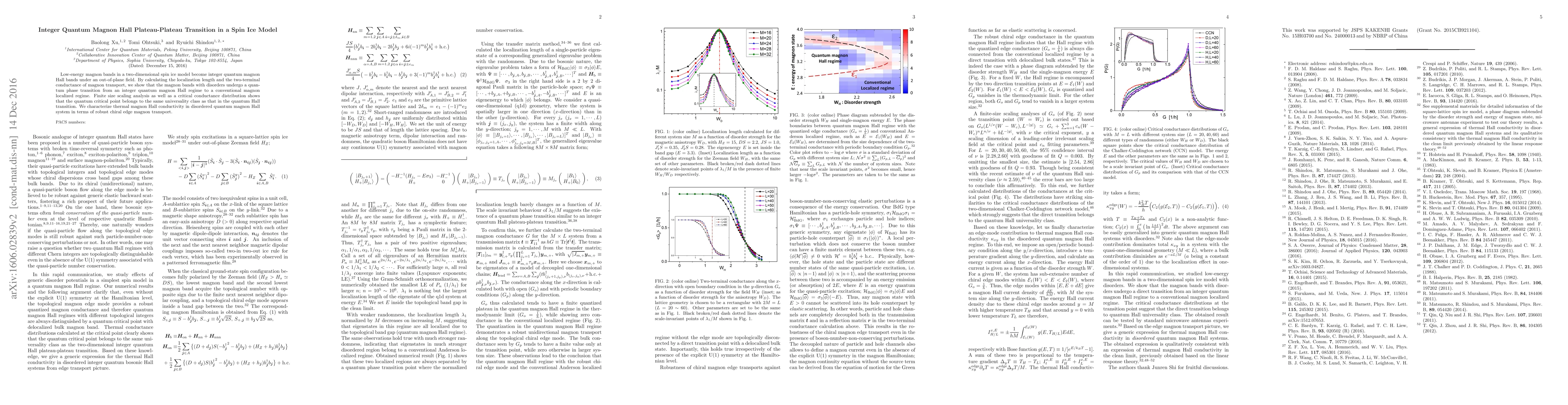 This paper investigates the quantum magnon Hall effect in a two-dimensional spin ice model, demonstrating that disordered magnon bands transition from an integer quantum magnon Hall regime to a localized regime. The study identifies the critical point as belonging to the same universality class as the quantum Hall transition, characterized by robust chiral edge magnon transport.