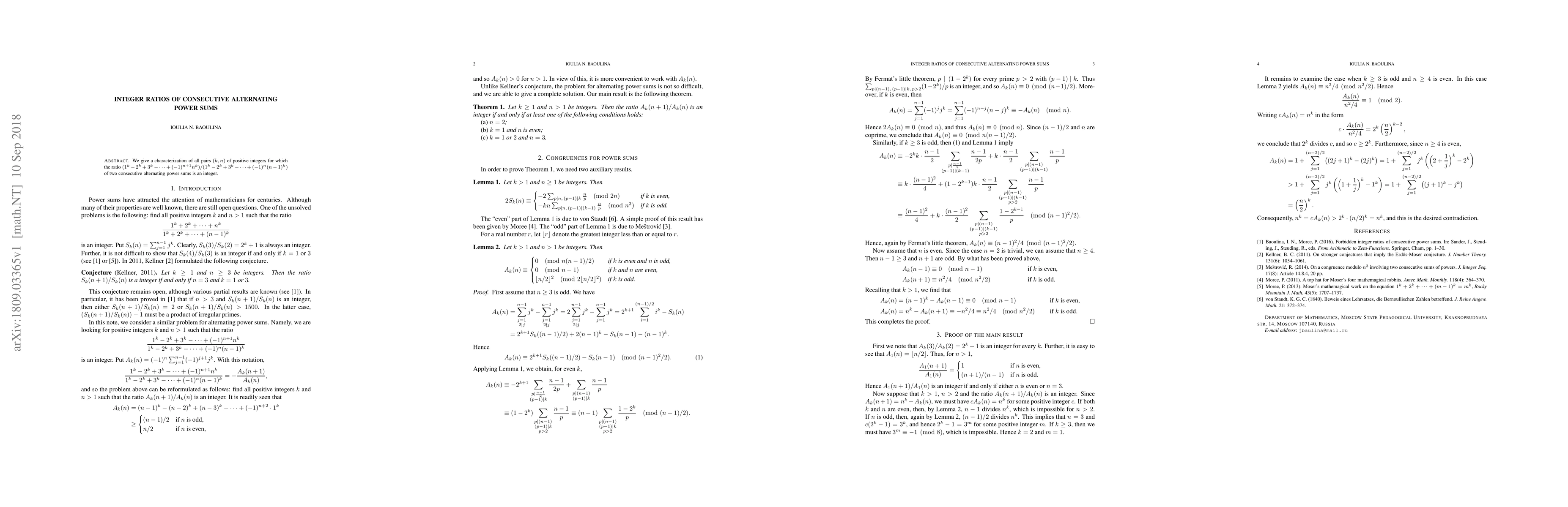 We give a characterization of all pairs $(k,n)$ of positive integers for which the ratio $$ \frac{1^k-2^k+3^k-\dots+(-1)^{n+1} n^k}{1^k-2^k+3^k-\dots+(-1)^{n}(n-1)^k} $$ of two consecutive alternating power sums is an integer.