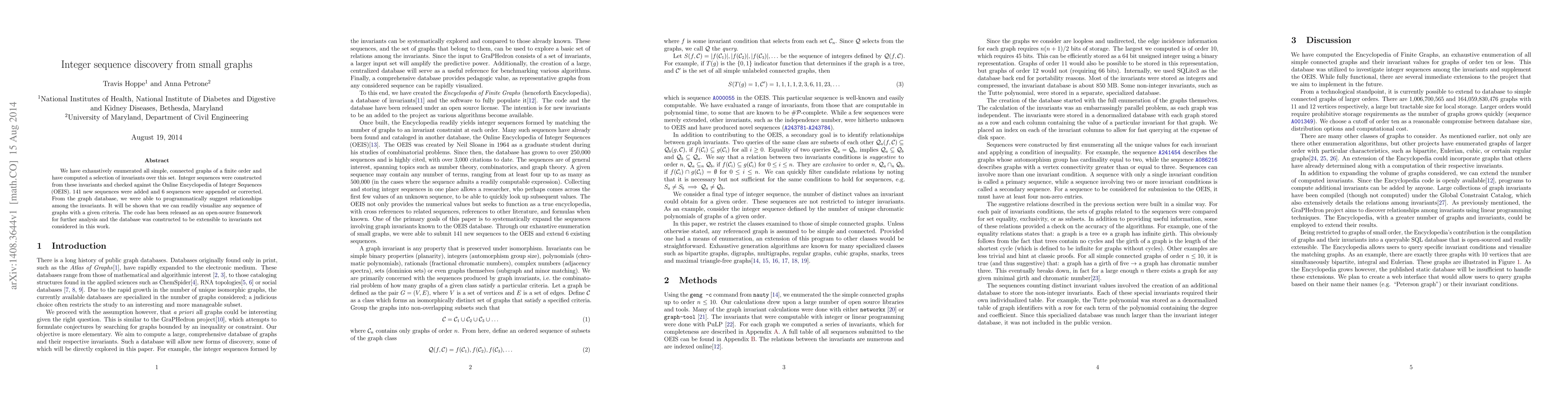 We have exhaustively enumerated all simple, connected graphs of a finite order and have computed a selection of invariants over this set. Integer sequences were constructed from these invariants and checked against the Online Encyclopedia of Integer Sequences (OEIS). 141 new sequences were added and 6 sequences were appended or corrected. From the graph database, we were able to programmatically suggest relationships among the invariants. It will be shown that we can readily visualize any sequence of graphs with a given criteria. The code has been released as an open-source framework for further analysis and the database was constructed to be extensible to invariants not considered in this work.