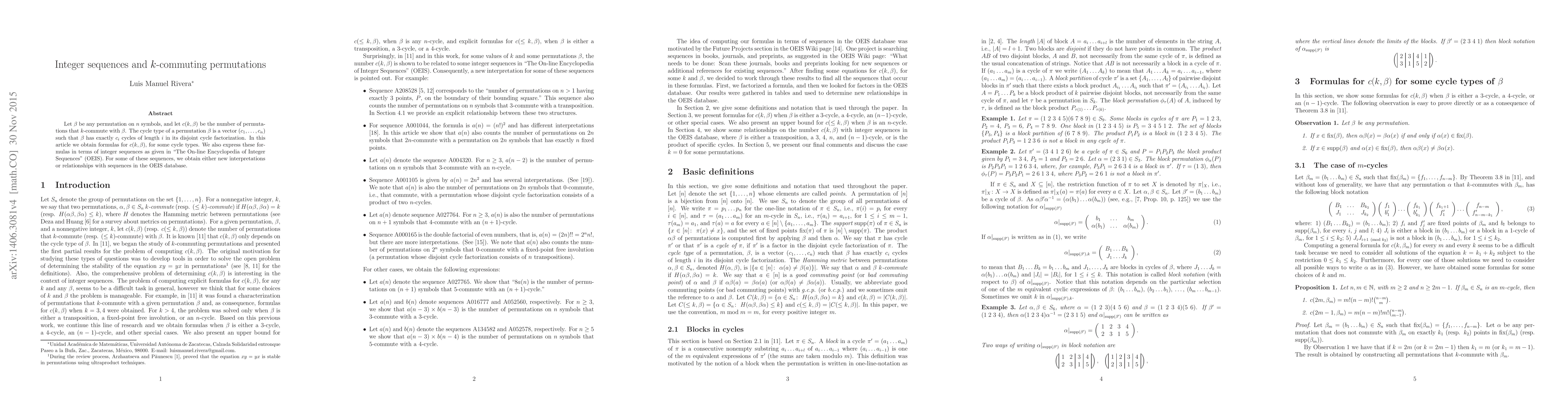 This paper derives formulas for the number of permutations that $k$-commute with a given permutation $\beta$ based on $\beta$'s cycle type. It expresses these results in terms of integer sequences from the OEIS, providing new interpretations or relationships for some sequences.