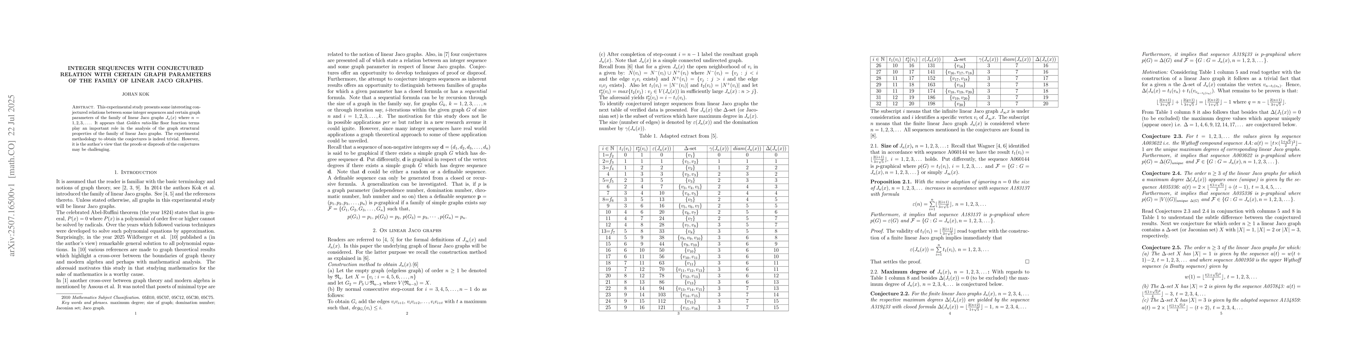 This experimental study presents some interesting conjectured relations between some integer sequences and certain graph parameters of the family of linear Jaco graphs $J_n(x)$ where $n = 1,2,3,\dots$. It appears that $\textit{Golden ratio}$-like floor function terms play an important role in the analysis of the graph structural properties of the family of linear Jaco graphs. The experimental methodology to obtain the conjectures is indeed trivial. However, it is the author's view that the proofs or disproofs of the conjectures may be challenging.