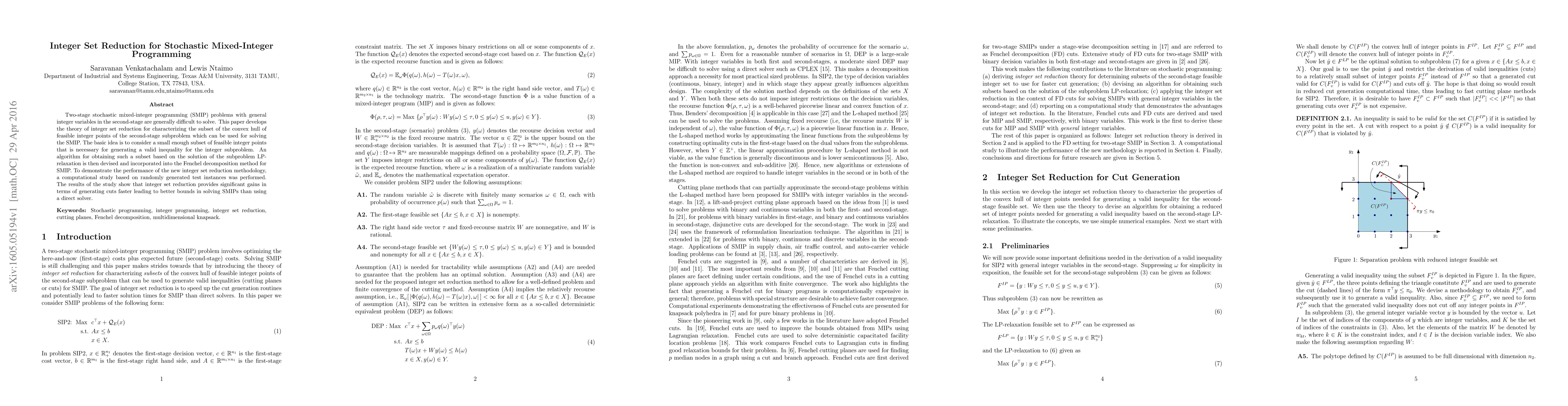 Two-stage stochastic mixed-integer programming (SMIP) problems with general integer variables in the second-stage are generally difficult to solve. This paper develops the theory of integer set reduction for characterizing the subset of the convex hull of feasible integer points of the second-stage subproblem which can be used for solving the SMIP. The basic idea is to consider a small enough subset of feasible integer points that is necessary for generating a valid inequality for the integer subproblem. An algorithm for obtaining such a subset based on the solution of the subproblem LP-relaxation is then devised and incorporated into the Fenchel decomposition method for SMIP. To demonstrate the performance of the new integer set reduction methodology, a computational study based on randomly generated test instances was performed. The results of the study show that integer set reduction provides significant gains in terms of generating cuts faster leading to better bounds in solving SMIPs than using a direct solver.