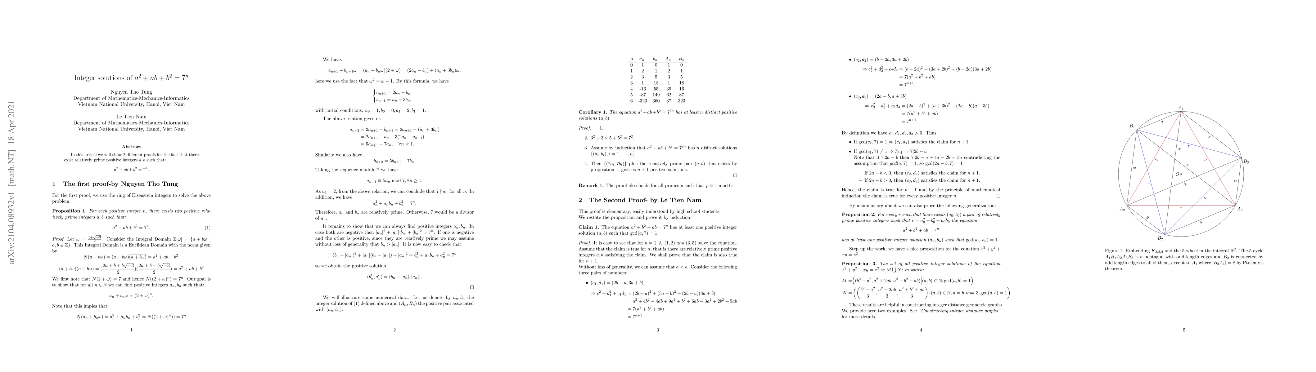 Researchers prove that there exist pairs of relatively prime positive integers a and b such that a^2 + ab + b^2 equals 7 raised to any power n. The paper presents two different proofs for this mathematical statement.