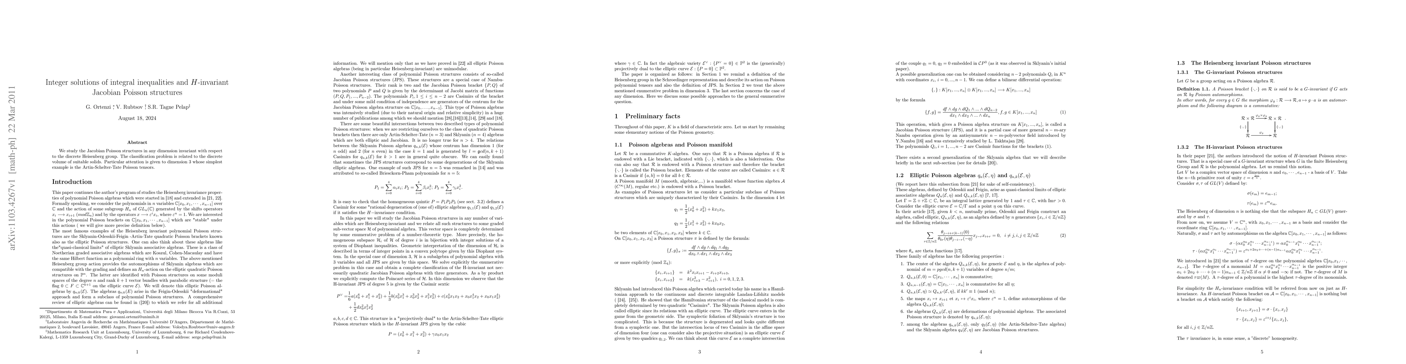 Summary: The paper investigates Jacobian Poisson structures invariant under the discrete Heisenberg group, focusing on classification linked to the discrete volume of solids, with a special emphasis on dimension 3 and its simplest example, the Artin-Schelter-Tate Poisson tensors.
