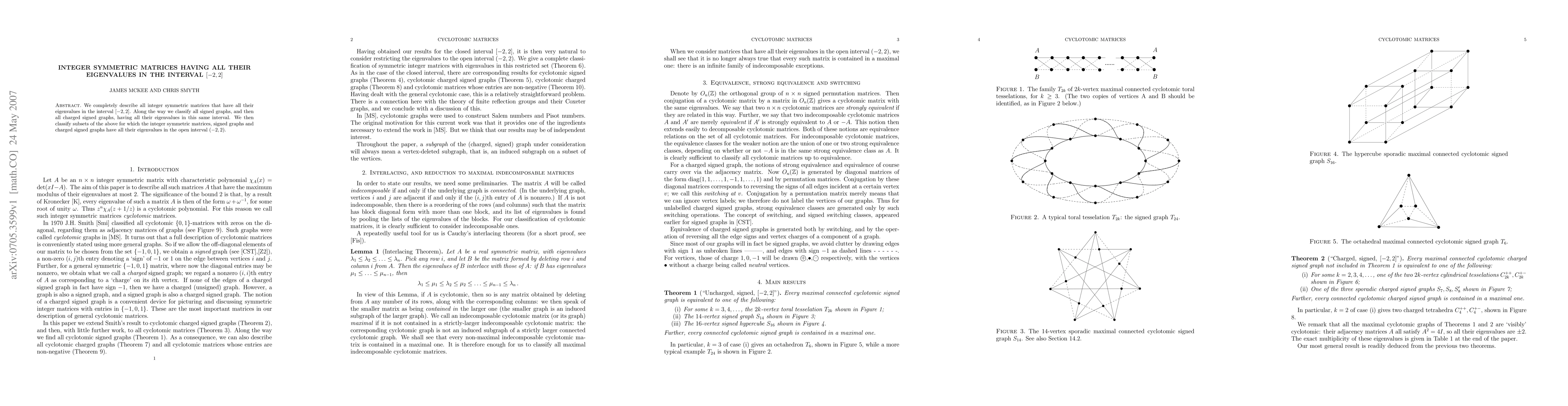 We completely describe all integer symmetric matrices that have all their eigenvalues in the interval [-2,2]. Along the way we classify all signed graphs, and then all charged signed graphs, having all their eigenvalues in this same interval. We then classify subsets of the above for which the integer symmetric matrices, signed graphs and charged signed graphs have all their eigenvalues in the open interval (-2,2).