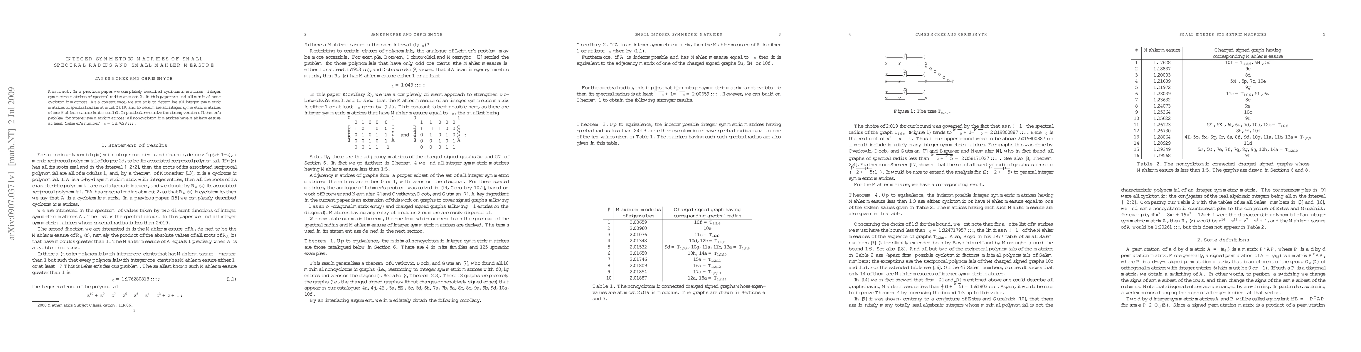 In a previous paper we completely described cyclotomic matrices--integer symmetric matrices of spectral radius at most 2. In this paper we find all minimal noncyclotomic matrices. As a consequence, we are able to determine all integer symmetric matrices of spectral radius at most 2.019, and to determine all integer symmetric matrices whose Mahler measure is at most 1.3. In particular we solve the strong version of Lehmer's problem for integer symmetric matrices: all noncyclotomic matrices have Mahler measure at least "Lehmer's number" 1.17628... .