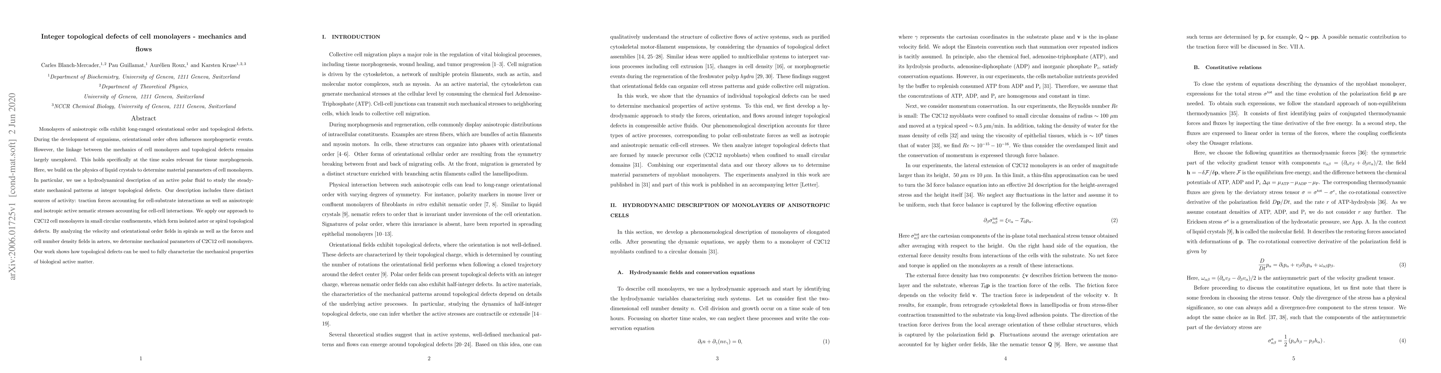 This paper explores the mechanics of anisotropic cell monolayers and their topological defects, using a hydrodynamical model to analyze steady-state mechanical patterns. It determines material parameters for C2C12 cell monolayers, revealing how topological defects can characterize the mechanical properties of biological active matter.