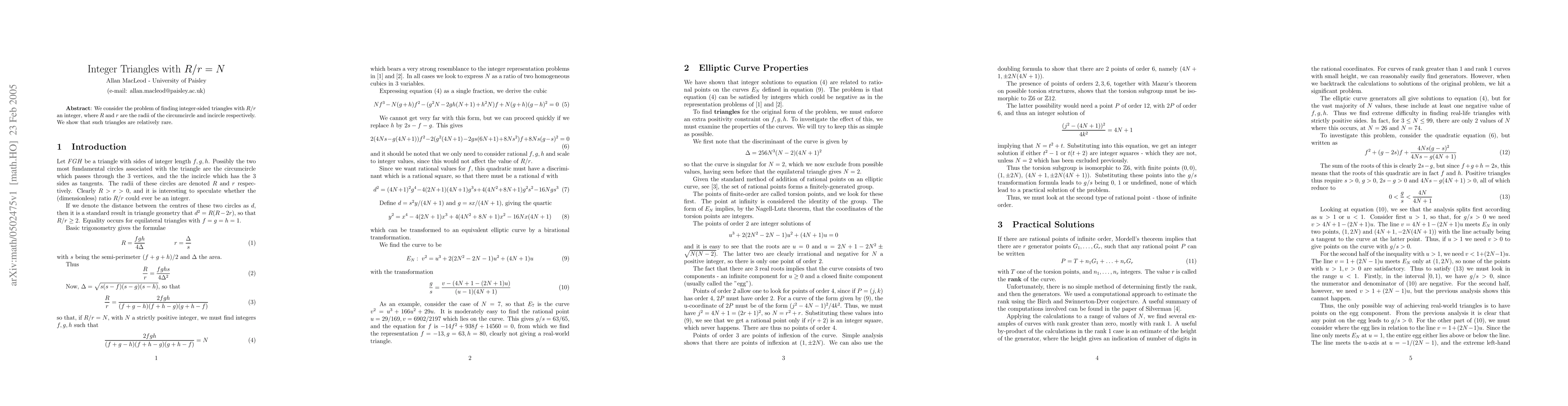 Summary: This paper investigates integer-sided triangles where the ratio of the circumcircle radius to the incircle radius is an integer, demonstrating that such triangles are uncommon.