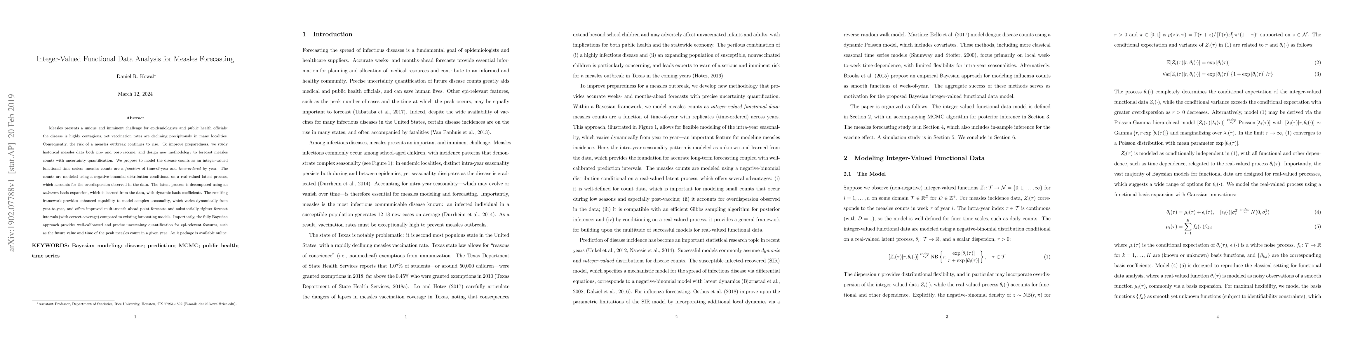 Measles presents a unique and imminent challenge for epidemiologists and public health officials: the disease is highly contagious, yet vaccination rates are declining precipitously in many localities. Consequently, the risk of a measles outbreak continues to rise. To improve preparedness, we study historical measles data both pre- and post-vaccine, and design new methodology to forecast measles counts with uncertainty quantification. We propose to model the disease counts as an integer-valued functional time series: measles counts are a function of time-of-year and time-ordered by year. The counts are modeled using a negative-binomial distribution conditional on a real-valued latent process, which accounts for the overdispersion observed in the data. The latent process is decomposed using an unknown basis expansion, which is learned from the data, with dynamic basis coefficients. The resulting framework provides enhanced capability to model complex seasonality, which varies dynamically from year-to-year, and offers improved multi-month ahead point forecasts and substantially tighter forecast intervals (with correct coverage) compared to existing forecasting models. Importantly, the fully Bayesian approach provides well-calibrated and precise uncertainty quantification for epi-relevent features, such as the future value and time of the peak measles count in a given year. An R package is available online.