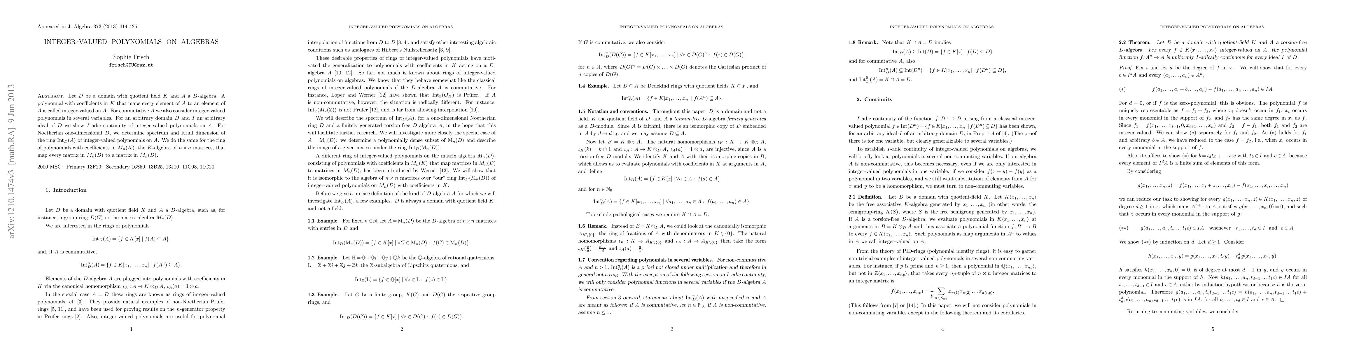 This paper explores integer-valued polynomials on D-algebras A, proving I-adic continuity for arbitrary domains D and ideals I. It also determines the spectrum and Krull dimension of the ring Int_D(A) for Noetherian one-dimensional D, and similarly for polynomials mapping matrices in M_n(K) to matrices in M_n(D).