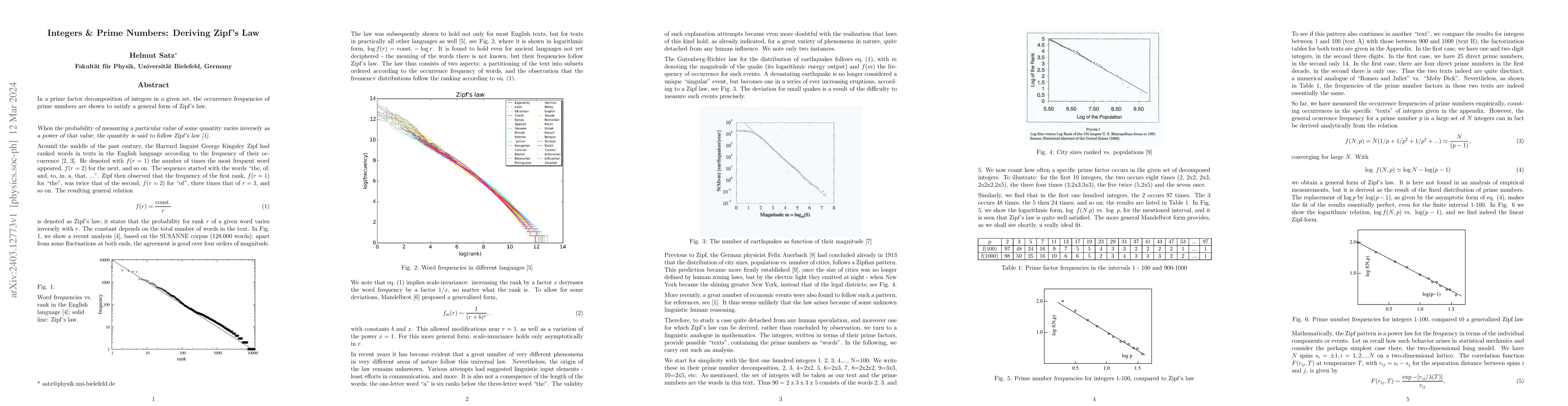 Summary: This research demonstrates that prime number decompositions in a set of integers exhibit frequency distributions conforming to a generalized form of Zipf's law, revealing a surprising connection between number theory and statistical linguistics.