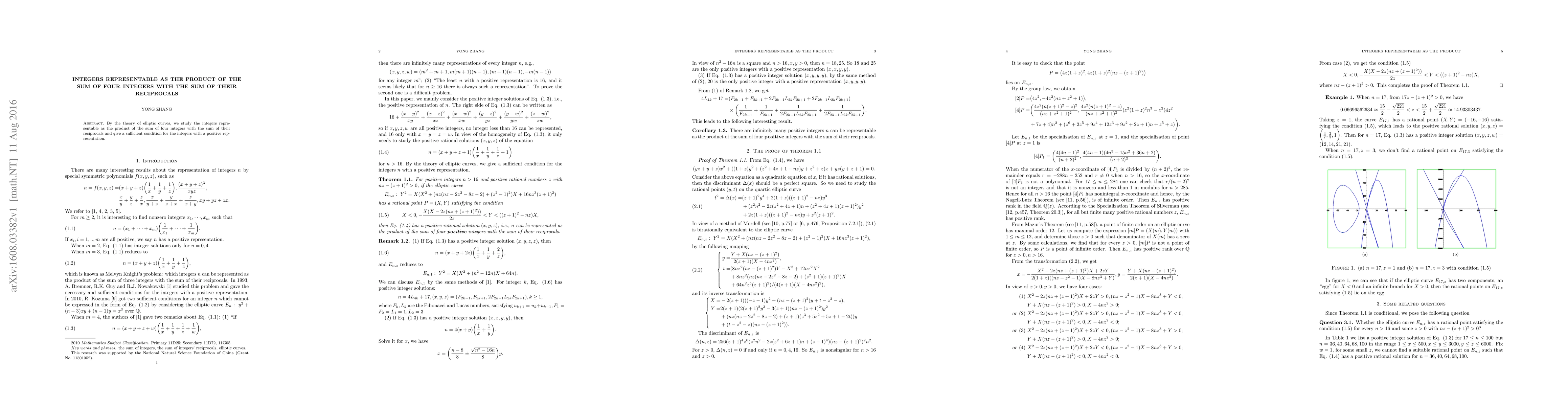 Summary: This paper uses elliptic curve theory to investigate integers that can be expressed as the product of the sum of four integers and the sum of their reciprocals, providing a sufficient condition for positive representation of such integers.