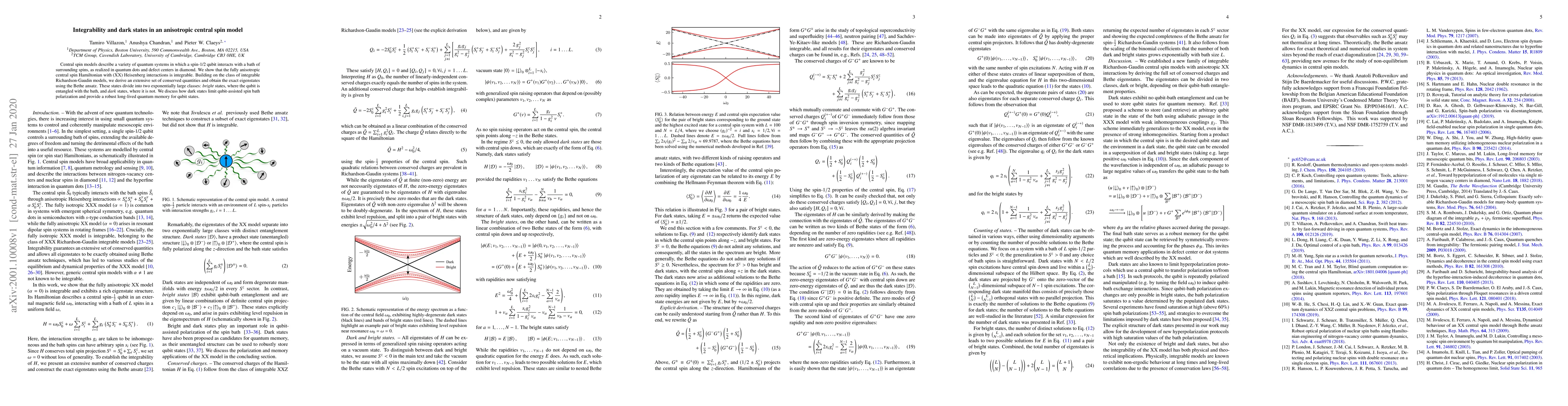 This paper demonstrates that a fully anisotropic central spin Hamiltonian with (XX) Heisenberg interactions is integrable, deriving conserved quantities and exact eigenstates via the Bethe ansatz. It identifies two classes of states: bright states where the qubit is entangled with the bath, and dark states where it is not, which serve as a robust long-lived quantum memory.