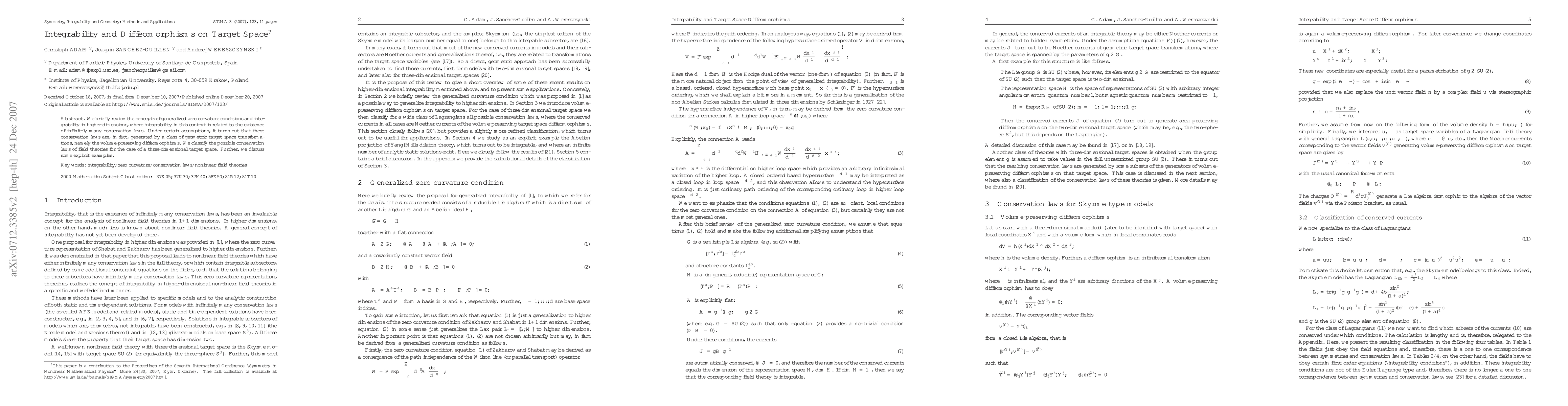 This paper reviews generalized zero curvature conditions and integrability in higher dimensions, linking integrability to the existence of infinitely many conservation laws generated by volume-preserving diffeomorphisms on a three-dimensional target space. It classifies the conservation laws for field theories and provides explicit examples.