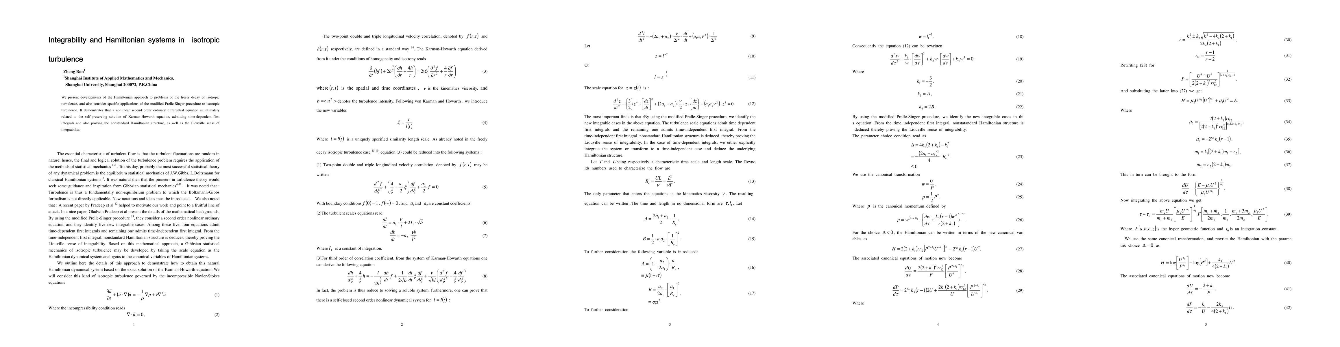 We present developments of the Hamiltonian approach to problems of the freely decay of isotropic turbulence, and also consider specific applications of the modified Prelle-Singer procedure to isotropic turbulence. It demonstrates that a nonlinear second order ordinary differential equation is intimately related to the self-preserving solution of Karman-Howarth equation, admitting time-dependent first integrals and also proving the nonstandard Hamiltonian structure, as well as the Liouville sense of integrability.