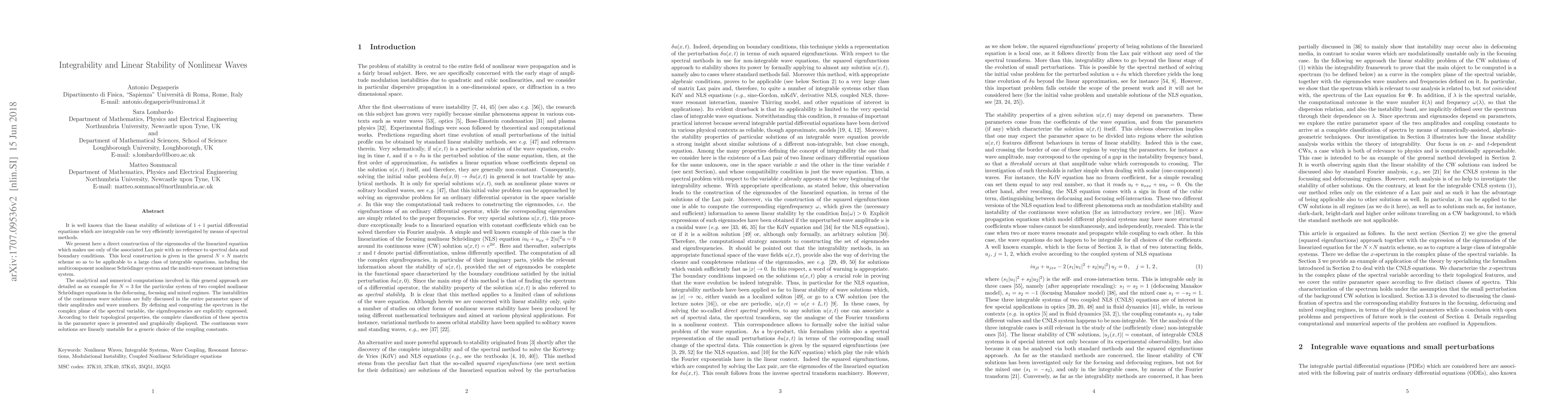 Researchers develop a method to analyze linear stability of nonlinear waves without spectral data, applicable to integrable equations like the nonlinear Schroedinger system, and find that continuous wave solutions are linearly unstable in most cases.