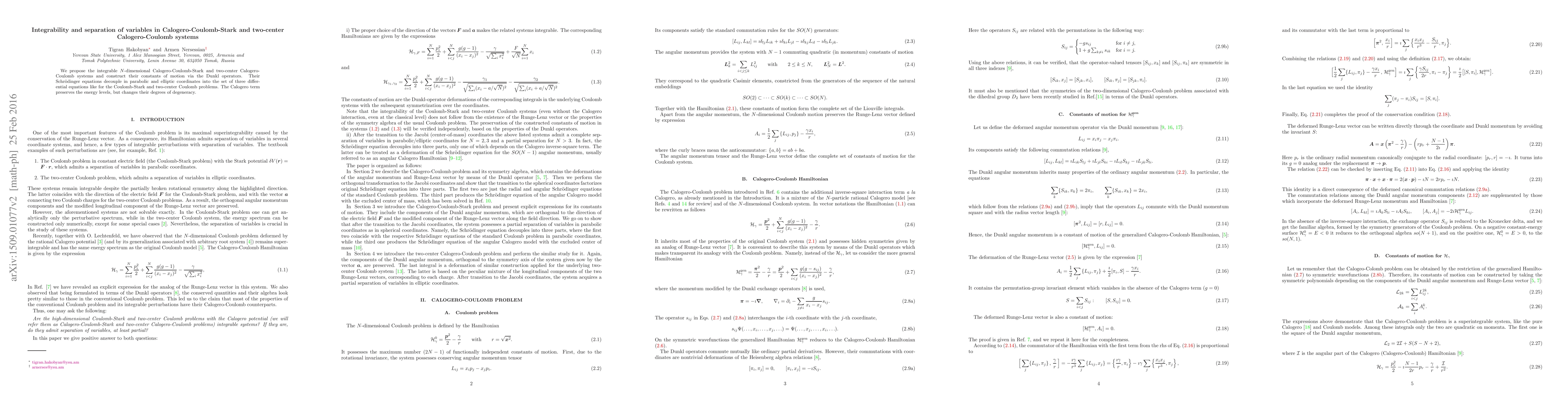 We propose the integrable N-dimensional Calogero-Coulomb-Stark and two-center Calogero-Coulomb systems and construct their constants of motion via the Dunkl operators. Their Schr\"odinger equations decouple in parabolic and elliptic coordinates into the set of three differential equations like for the Coulomb-Stark and two-center Coulomb problems. The Calogero term preserves the energy levels, but changes their degrees of degeneracy.