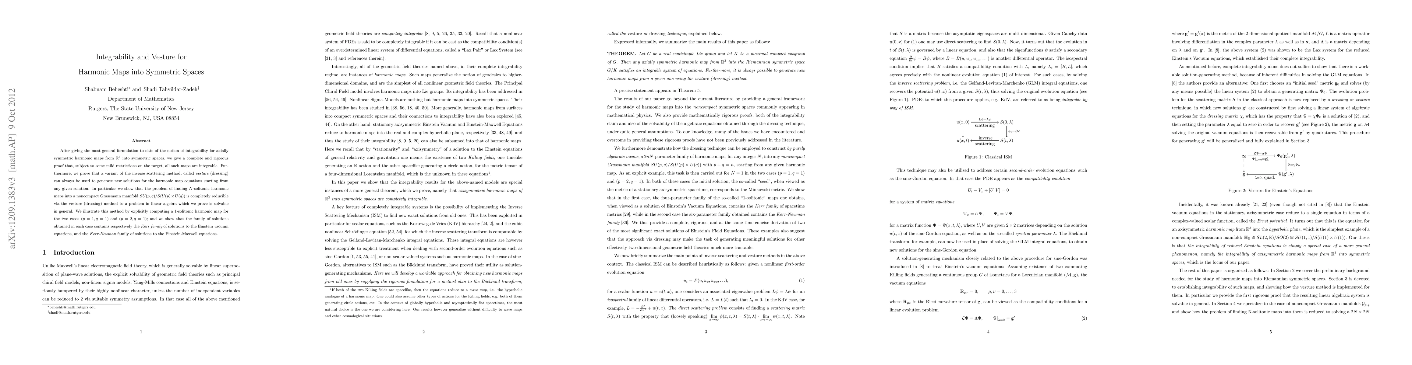 After giving the most general formulation to date of the notion of integrability for axially symmetric harmonic maps from R^3 into symmetric spaces, we give a complete and rigorous proof that, subject to some mild restrictions on the target, all such maps are integrable. Furthermore, we prove that a variant of the inverse scattering method, called vesture (dressing) can always be used to generate new solutions for the harmonic map equations starting from any given solution. In particular we show that the problem of finding N-solitonic harmonic maps into a noncompact Grassmann manifold SU(p,q)/S(U(p) x U(q)) is completely reducible via the vesture (dressing) method to a problem in linear algebra which we prove is solvable in general. We illustrate this method by explicitly computing a 1-solitonic harmonic map for the two cases (p = 1, q = 1) and (p = 2, q = 1); and we show that the family of solutions obtained in each case contains respectively the Kerr family of solutions to the Einstein vacuum equations, and the Kerr-Newman family of solutions to the Einstein-Maxwell equations.