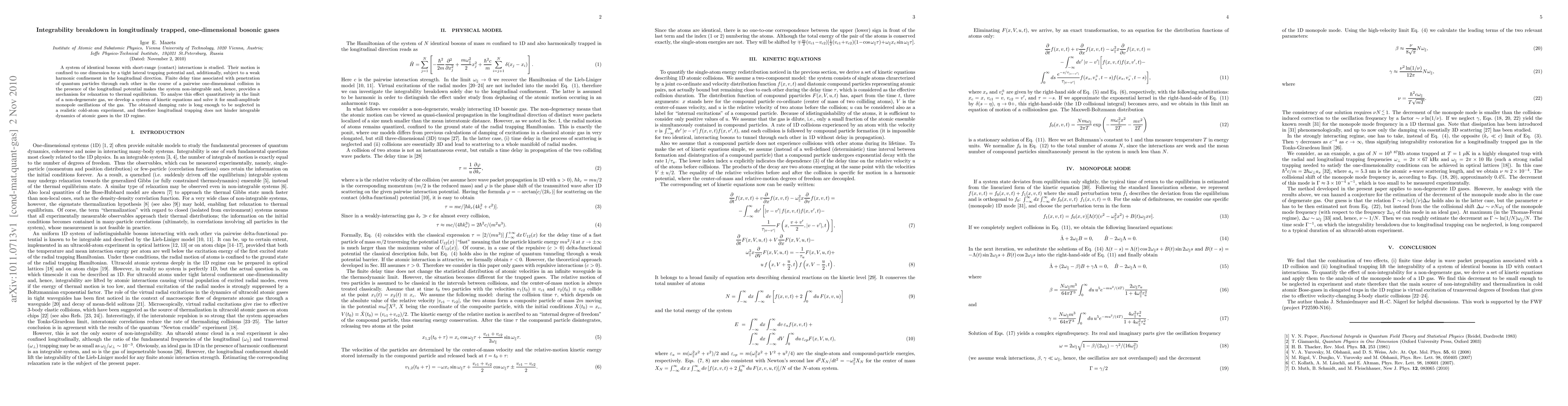 A system of identical bosons with short-range (contact) interactions is studied. Their motion is confined to one dimension by a tight lateral trapping potential and, additionally, subject to a weak harmonic confinement in the longitudinal direction. Finite delay time associated with penetration of quantum particles through each other in the course of a pairwise one-dimensional collision in the presence of the longitudinal potential makes the system non-integrable and, hence, provides a mechanism for relaxation to thermal equilibrium. To analyse this effect quantitatively in the limit of a non-degenerate gas, we develop a system of kinetic equations and solve it for small-amplitude monopole oscillations of the gas. The obtained damping rate is long enough to be neglected in a realistic cold-atom experiment, and therefore longitudinal trapping does not hinder integrable dynamics of atomic gases in the 1D regime.