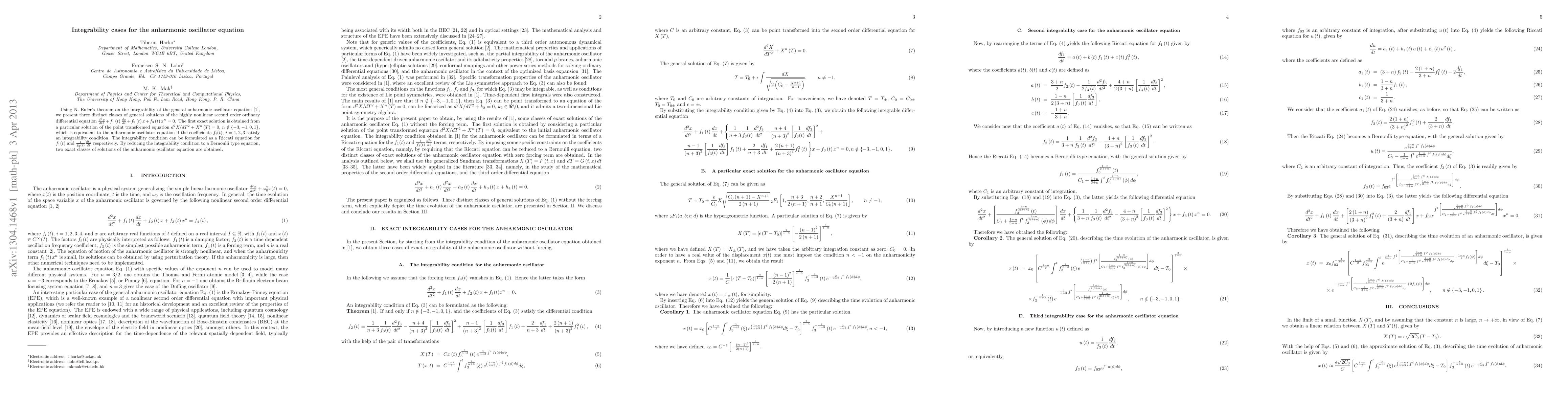 This paper explores the integrability of the anharmonic oscillator equation using Euler's theorem, identifying three distinct classes of solutions. It derives exact solutions from a point-transformed equation and formulates an integrability condition as a Riccati equation, leading to two additional classes of solutions.