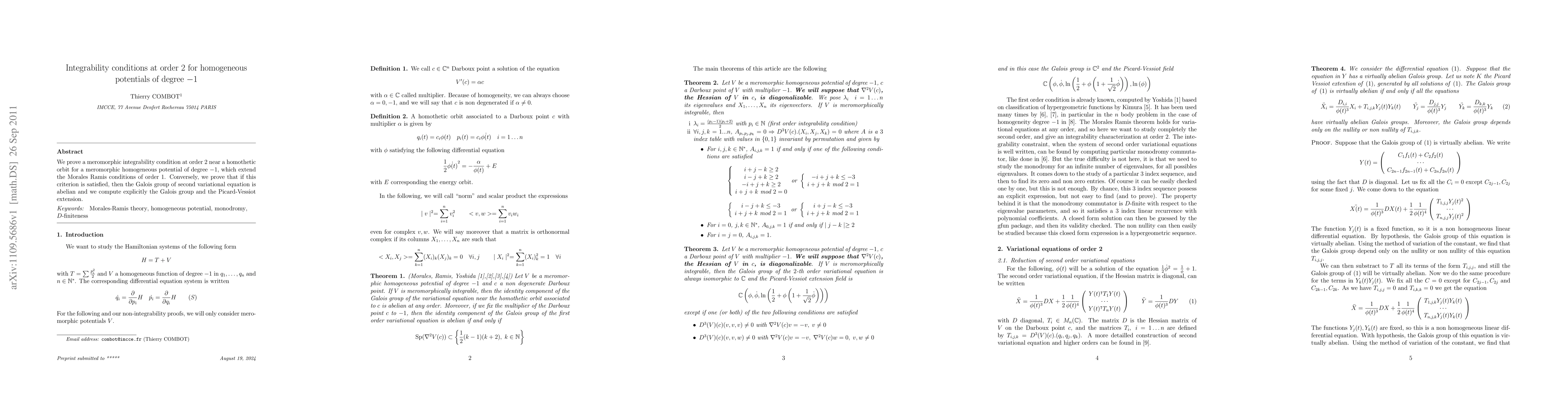 We prove a meromorphic integrability condition at order 2 near a homothetic orbit for a meromorphic homogeneous potential of degree -1, which extend the Morales Ramis conditions of order 1. Conversely, we prove that if this criterion is satisfied, then the Galois group of second order variational equation is abelian and we compute explicitly the Galois group and the Picard-Vessiot extension.