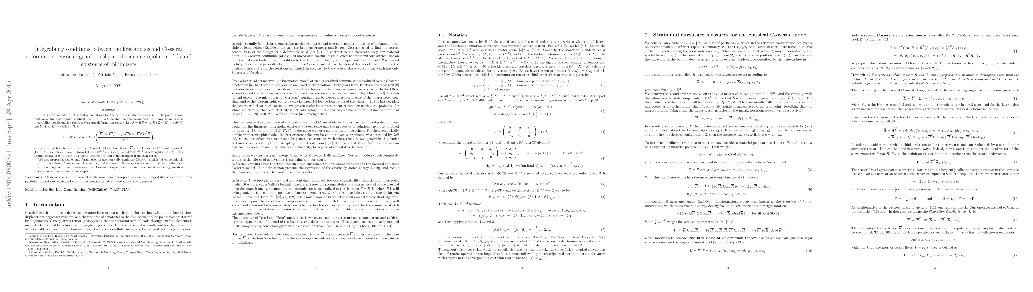 In this note we extend integrability conditions for the symmetric stretch tensor $U$ in the polar decomposition of the deformation gradient $\nabla\varphi=F=R\,U$ to the non-symmetric case. In doing so we recover integrability conditions for the first Cosserat deformation tensor. Let $F=\bar R\,\bar U$ with $\bar R:\Omega\subset\mathbb{R}^3\longrightarrow\mathrm{SO}(3)$ and $\bar U:\Omega\subset\mathbb{R}^3\longrightarrow \mathrm{GL}(3)$. Then $\mathfrak{K}:={\bar R}^T\mathrm{Grad}\,{\bar R}=\mathrm{Anti}\Big( \frac{1}{\mathrm{det} \bar U}\Big[\bar U(\mathrm{Curl} \bar U)^T-\frac{1}{2} \mathrm{tr}(\bar U(\mathrm{Curl} \bar U)^T) 1\!\!1 \Big]\bar U\Big),$ giving a connection between the first Cosserat deformation tensor $\bar U$ and the second Cosserat tensor ${\mathfrak{K}}$. (Here, Anti denotes an isomorphism between $\mathbb{R}^{3\times 3}$ and $\mathfrak{So}(3):=\{\,\mathfrak{A}\in\mathbb{R}^{3\times 3\times 3}\,|\,\mathfrak{A}.u\in\mathfrak{so}(3)\;\forall u\in \mathbb{R}^3\}$.) The formula shows that it is not possible to prescribe $\bar U$ and $\mathfrak{K}$ independent from each other. We also propose a new energy formulation of geometrically nonlinear Cosserat models which completely separate the effects of nonsymmetric straining and curvature. For very weak constitutive assumptions (no direct boundary condition on rotations, zero Cosserat couple modulus, quadratic curvature energy) we show existence of minimizers in Sobolev-spaces.
