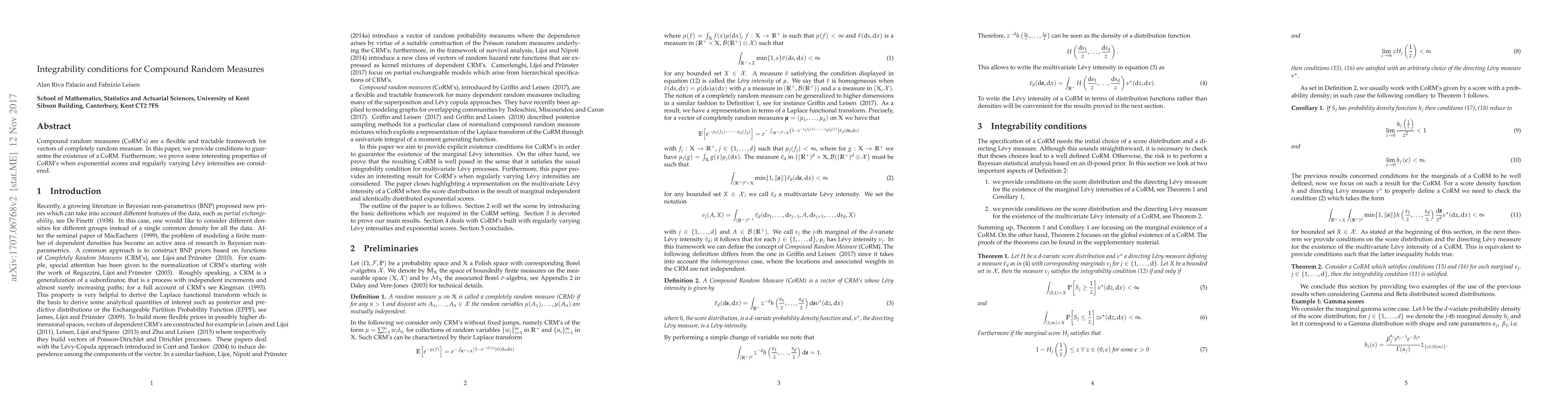 The paper provides conditions for the existence of Compound Random Measures (CoRM's) and proves properties when exponential scores and regularly varying Lévy intensities are considered.
