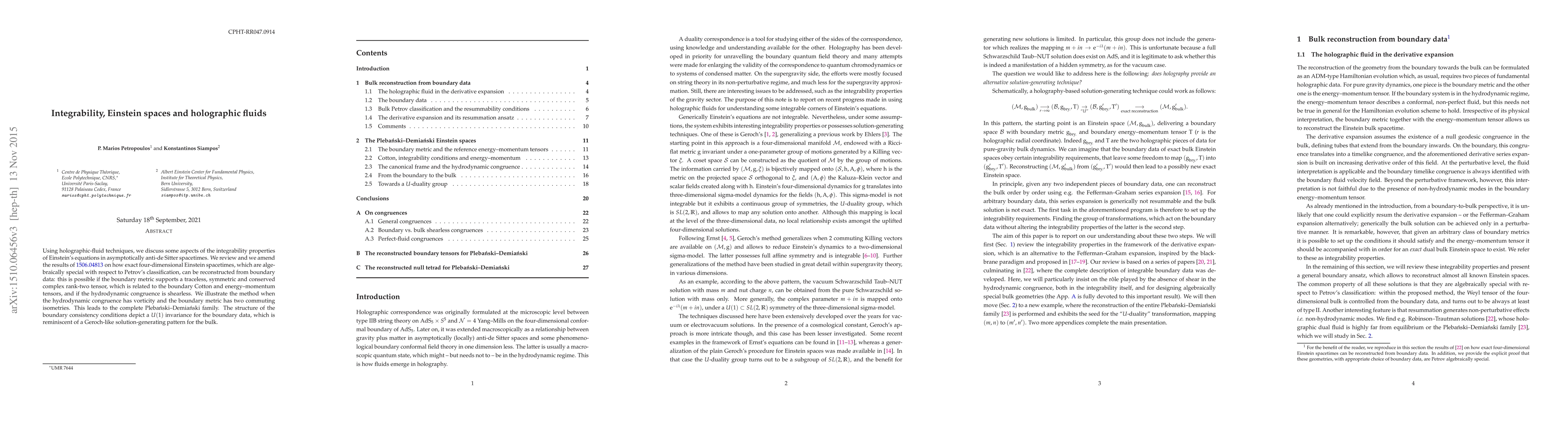 Using holographic-fluid techniques, we discuss some aspects of the integrability properties of Einstein's equations in asymptotically anti-de Sitter spacetimes. We review and we amend the results of 1506.04813 on how exact four-dimensional Einstein spacetimes, which are algebraically special with respect to Petrov's classification, can be reconstructed from boundary data: this is possible if the boundary metric supports a traceless, symmetric and conserved complex rank-two tensor, which is related to the boundary Cotton and energy-momentum tensors, and if the hydrodynamic congruence is shearless. We illustrate the method when the hydrodynamic congruence has vorticity and the boundary metric has two commuting isometries. This leads to the complete Plebanski-Demianski family. The structure of the boundary consistency conditions depict a U(1) invariance for the boundary data, which is reminiscent of a Geroch-like solution-generating pattern for the bulk.