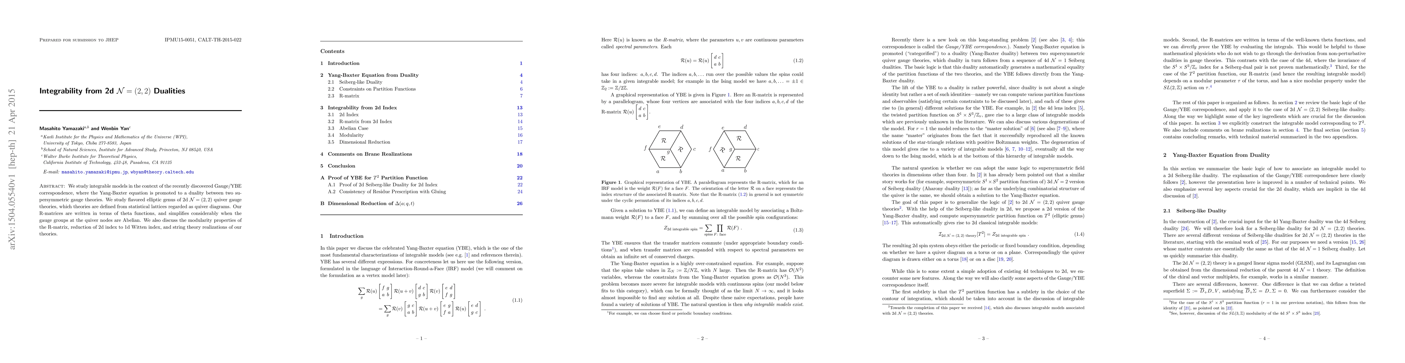 This paper explores integrable models via the Gauge/YBE correspondence, focusing on 2d $\mathcal{N}=(2,2)$ quiver gauge theories. It simplifies R-matrices using theta functions when gauge groups are Abelian, discusses modularity, and connects the 2d index to the 1d Witten index in string theory contexts.