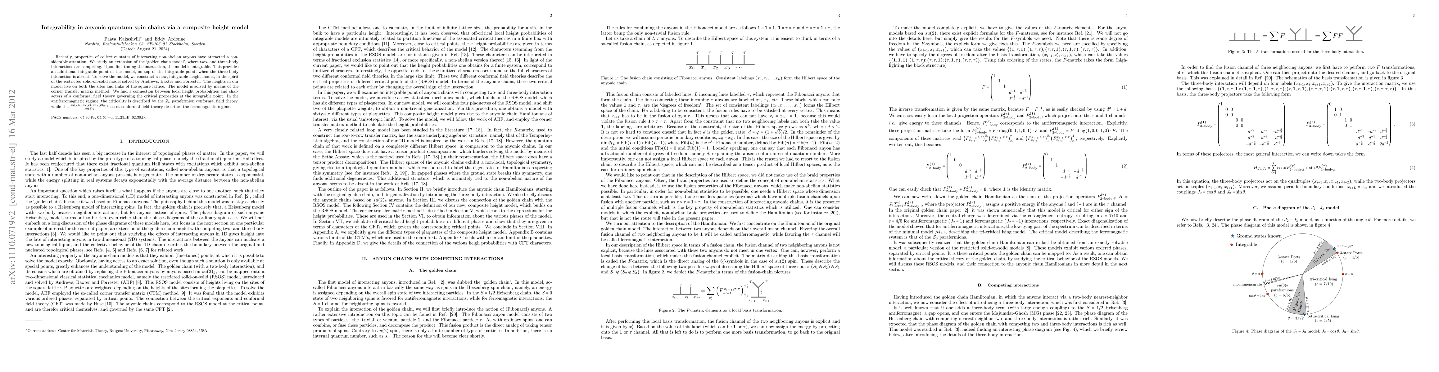 Recently, properties of collective states of interacting non-abelian anyons have attracted a considerable attention. We study an extension of the `golden chain model', where two- and three-body interactions are competing. Upon fine-tuning the interaction, the model is integrable. This provides an additional integrable point of the model, on top of the integrable point, when the three-body interaction is absent. To solve the model, we construct a new, integrable height model, in the spirit of the restricted solid-on-solid model solved by Andrews, Baxter and Forrester. The heights in our model live on both the sites and links of the square lattice. The model is solved by means of the corner transfer matrix method. We find a connection between local height probabilities and characters of a conformal field theory governing the critical properties at the integrable point. In the antiferromagnetic regime, the criticality is described by the Z_k parafermion conformal field theory, while the su(2)_1 x su(2)_1 x su(2)_(k-2) / su(2)_k coset conformal field theory describes the ferromagnetic regime.