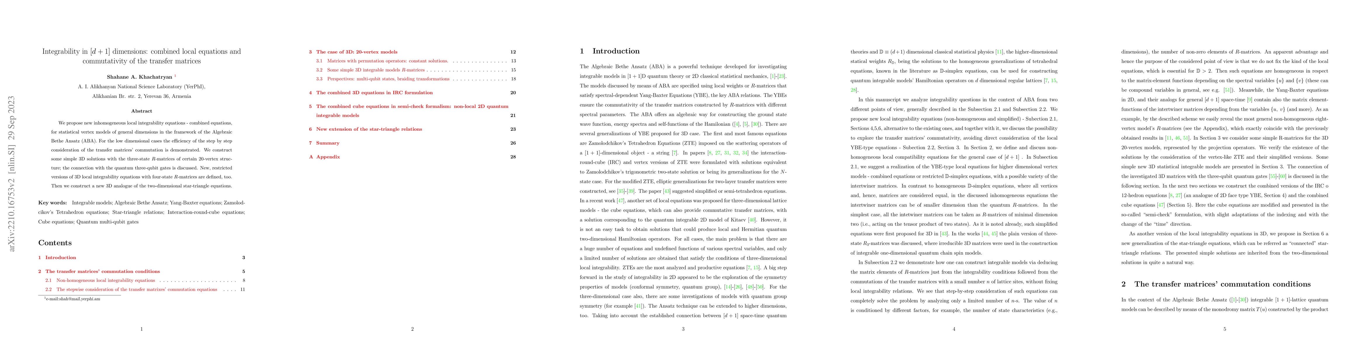This paper introduces new inhomogeneous local integrability equations for statistical vertex models in $[d+1]$ dimensions using the Algebraic Bethe Ansatz. It demonstrates the effectiveness of transfer matrix commutation in low dimensions and constructs simple 3D solutions linked to quantum three-qubit gates.