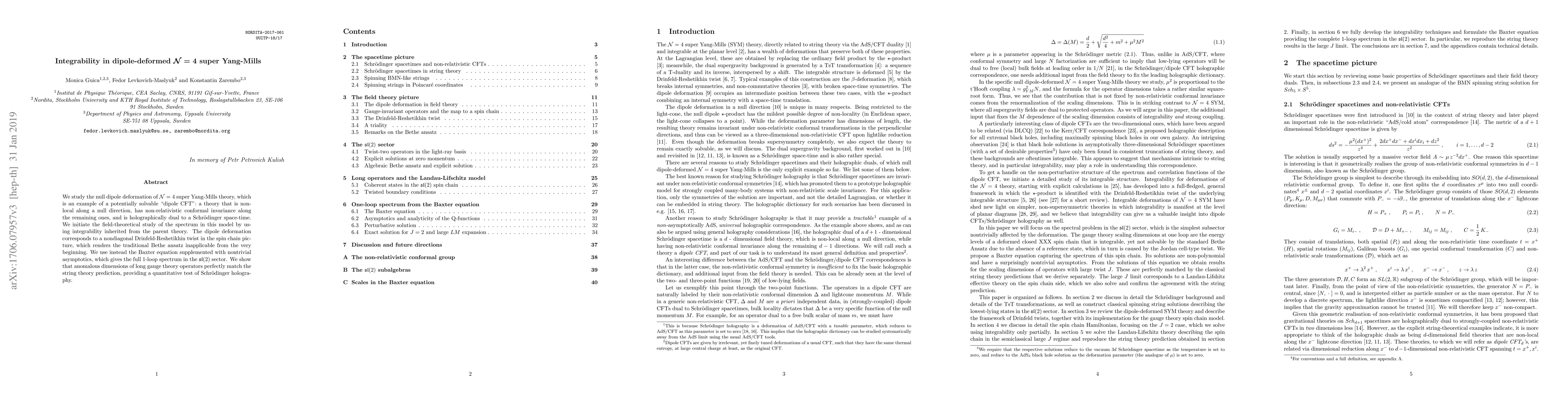 We study the null dipole deformation of N=4 super Yang-Mills theory, which is an example of a potentially solvable "dipole CFT": a theory that is non-local along a null direction, has non-relativistic conformal invariance along the remaining ones, and is holographically dual to a Schrodinger space-time. We initiate the field-theoretical study of the spectrum in this model by using integrability inherited from the parent theory. The dipole deformation corresponds to a nondiagonal Drinfeld-Reshetikhin twist in the spin chain picture, which renders the traditional Bethe ansatz inapplicable from the very beginning. We use instead the Baxter equation supplemented with nontrivial asymptotics, which gives the full 1-loop spectrum in the sl(2) sector. We show that anomalous dimensions of long gauge theory operators perfectly match the string theory prediction, providing a quantitative test of Schrodinger holography.