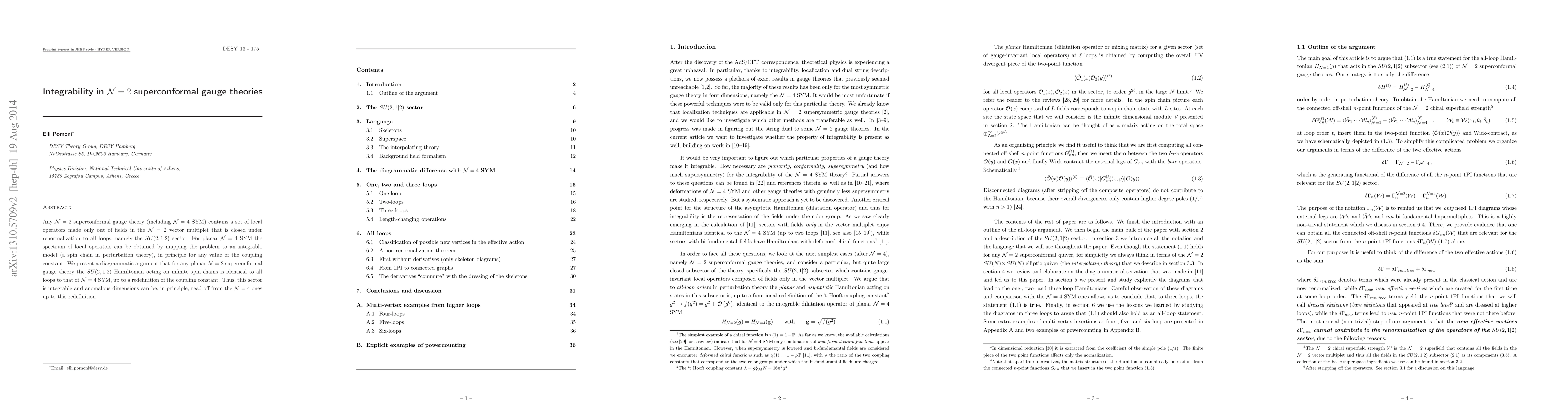 Any N=2 superconformal gauge theory (including N=4 SYM) contains a set of local operators made only out of fields in the N=2 vector multiplet that is closed under renormalization to all loops, namely the SU(2,1|2) sector. For planar N=4 SYM the spectrum of local operators can be obtained by mapping the problem to an integrable model (a spin chain in perturbation theory), in principle for any value of the coupling constant. We present a diagrammatic argument that for any planar N=2 superconformal gauge theory the SU(2,1|2) Hamiltonian acting on infinite spin chains is identical to all loops to that of N=4 SYM, up to a redefinition of the coupling constant. Thus, this sector is integrable and anomalous dimensions can be, in principle, read off from the N=4 ones up to this redefinition.
