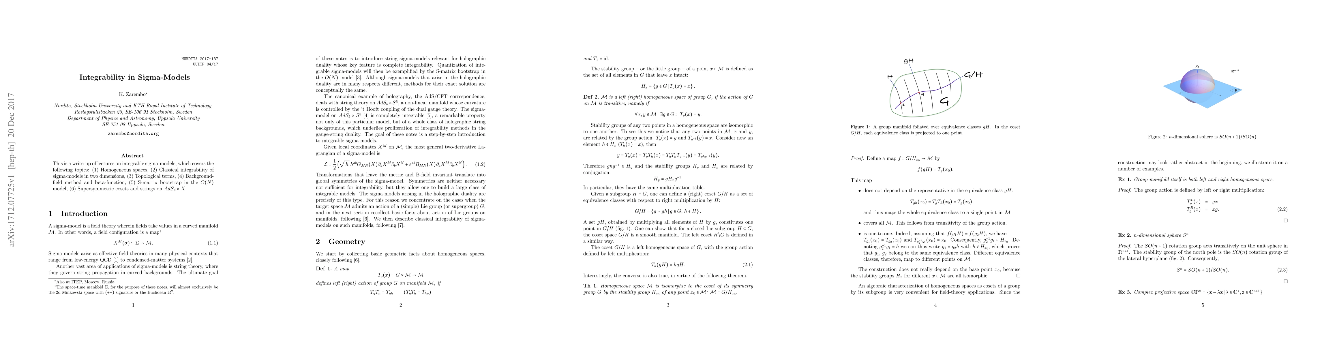 This paper reviews integrable sigma-models, focusing on classical integrability in two dimensions, topological terms, and the application of the background-field method. It also explores the S-matrix bootstrap in the O(N) model and supersymmetric cosets in the context of strings on AdS(d)xX.