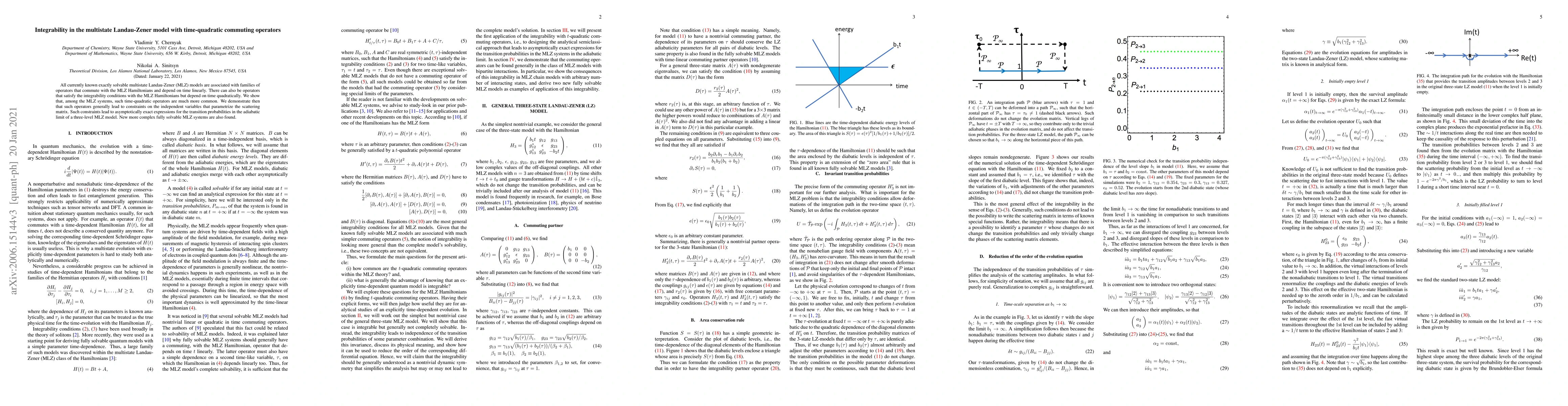 Exactly solvable multistate Landau-Zener (MLZ) models are associated with families of operators that commute with the MLZ Hamiltonians and depend on time linearly. There can also be operators that satisfy the integrability conditions with the MLZ Hamiltonians but depend on time quadratically. We show that, among the MLZ systems, such time-quadratic operators are much more common. We demonstrate then that such operators generally lead to constraints on the independent variables that parametrize the scattering matrix. We show how such constraints lead to asymptotically exact expressions for the transition probabilities in the adiabatic limit of a three-level MLZ model. New fully solvable MLZ systems are also found.