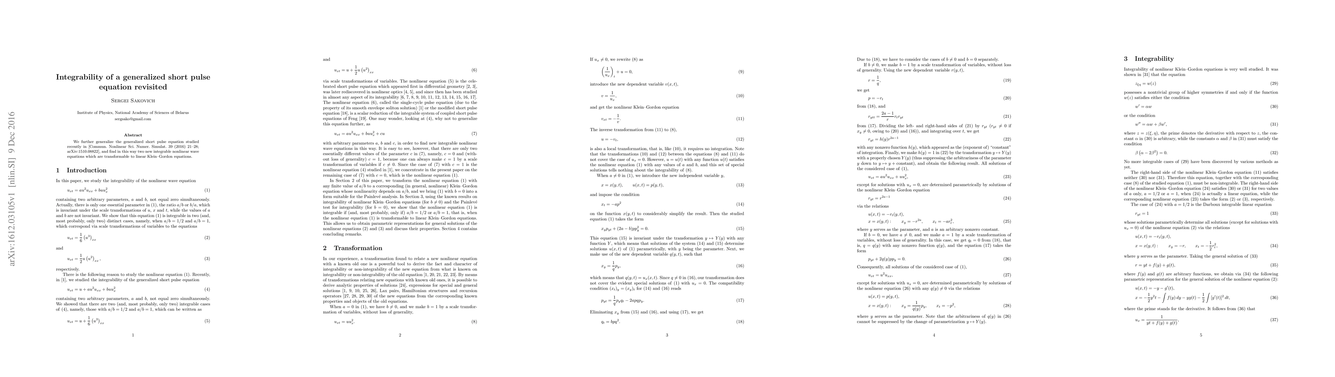 We further generalize the generalized short pulse equation studied recently in [Commun. Nonlinear Sci. Numer. Simulat. 39 (2016) 21-28; arXiv:1510.08822], and find in this way two new integrable nonlinear wave equations which are transformable to linear Klein-Gordon equations.