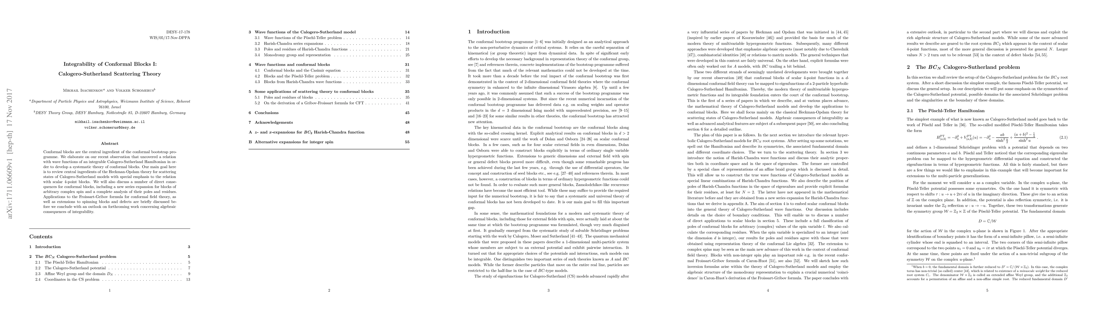 Conformal blocks are the central ingredient of the conformal bootstrap programme. We elaborate on our recent observation that uncovered a relation with wave functions of an integrable Calogero-Sutherland Hamiltonian in order to develop a systematic theory of conformal blocks. Our main goal here is to review central ingredients of the Heckman-Opdam theory for scattering states of Calogero-Sutherland models with special emphasis to the relation with scalar 4-point blocks. We will also discuss a number of direct consequences for conformal blocks, including a new series expansion for blocks of arbitrary complex spin and a complete analysis of their poles and residues. Applications to the Froissart-Gribov formula for conformal field theory, as well as extensions to spinning blocks and defects are briefly discussed before we conclude with an outlook on forthcoming work concerning algebraic consequences of integrability.