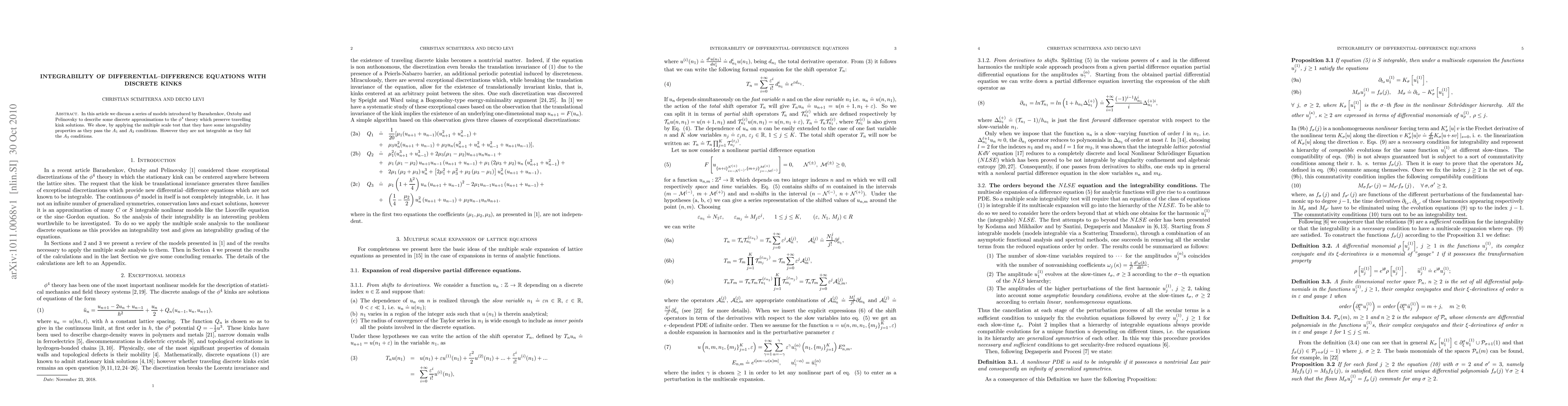 In this article we discuss a series of models introduced by Barashenkov, Oxtoby and Pelinovsky to describe some discrete approximations to the \phi^4 theory which preserve travelling kink solutions. We show, by applying the multiple scale test that they have some integrability properties as they pass the A_1 and A_2 conditions. However they are not integrable as they fail the A_3 conditions.