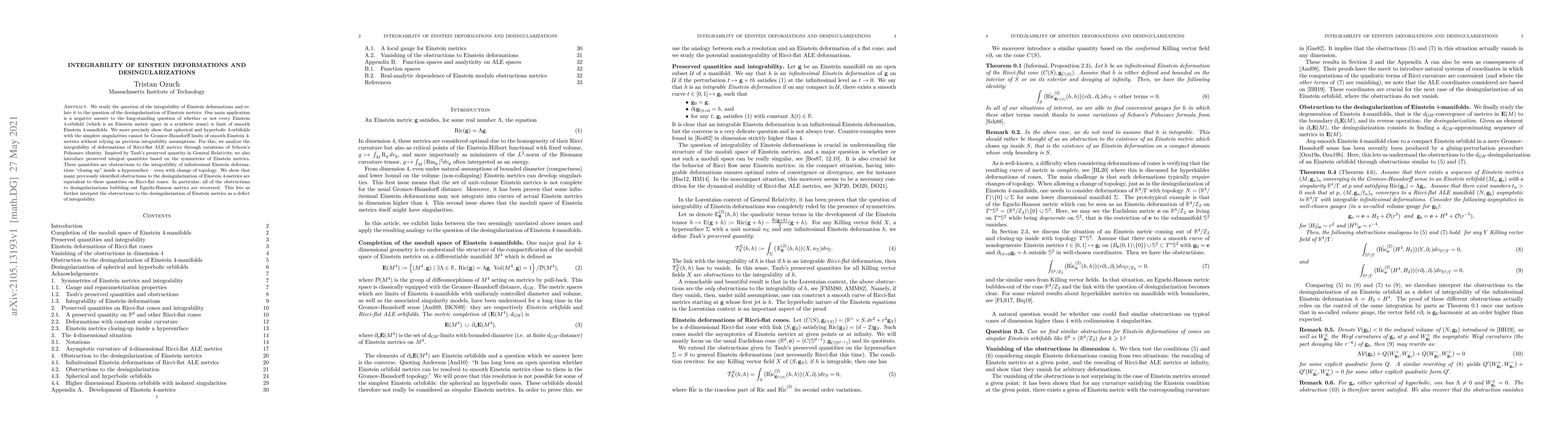 This paper investigates the integrability of Einstein deformations and addresses the desingularization of Einstein metrics, concluding that not all Einstein 4-orbifolds can be smoothly deformed into Einstein 4-manifolds. The study identifies preserved integral quantities as obstructions to the integrability of these deformations, revealing the fundamental defects in the desingularization process.